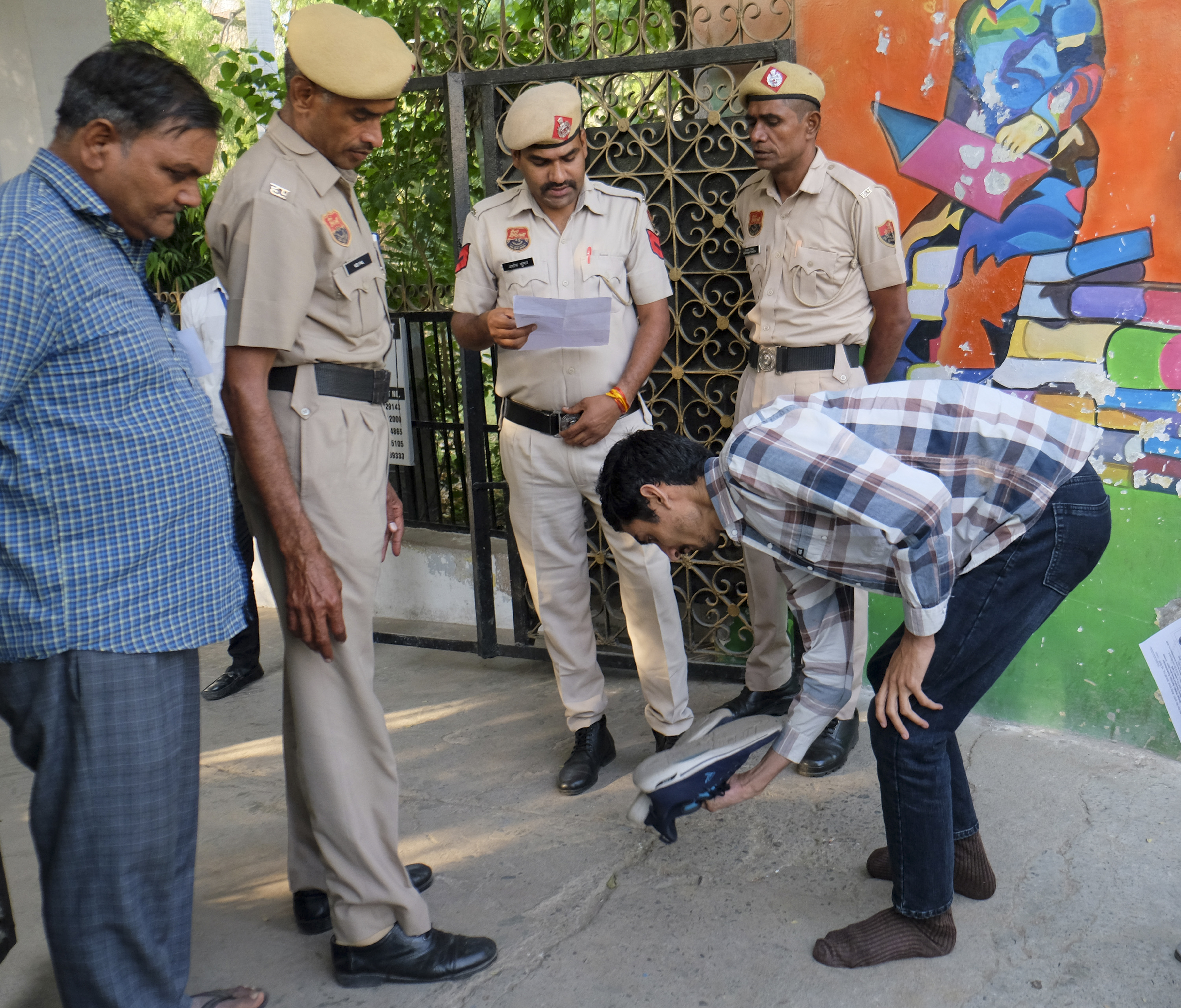 Gurugram: A candidate undergoes checking as he arrives at a centre to appear in the Union Public Service Commission (UPSC) Combined Defence Services Examination (1) 2025, in Gurugram, Sunday, April 13, 2025. (PTI Photo) (PTI04_13_2025_000052B)