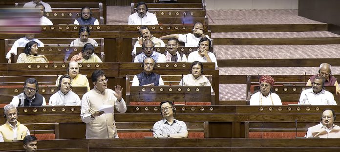 **EDS: THIRD PARTY IMAGE, SCREENGRAB VIA SANSAD TV** New Delhi: Union Minister Piyush Goyal speaks in the Rajya Sabha during the Monsoon session of Parliament, in New Delhi, Thursday, July 31, 2025. (Sansad TV via PTI Photo)(PTI07_31_2025_000306B)