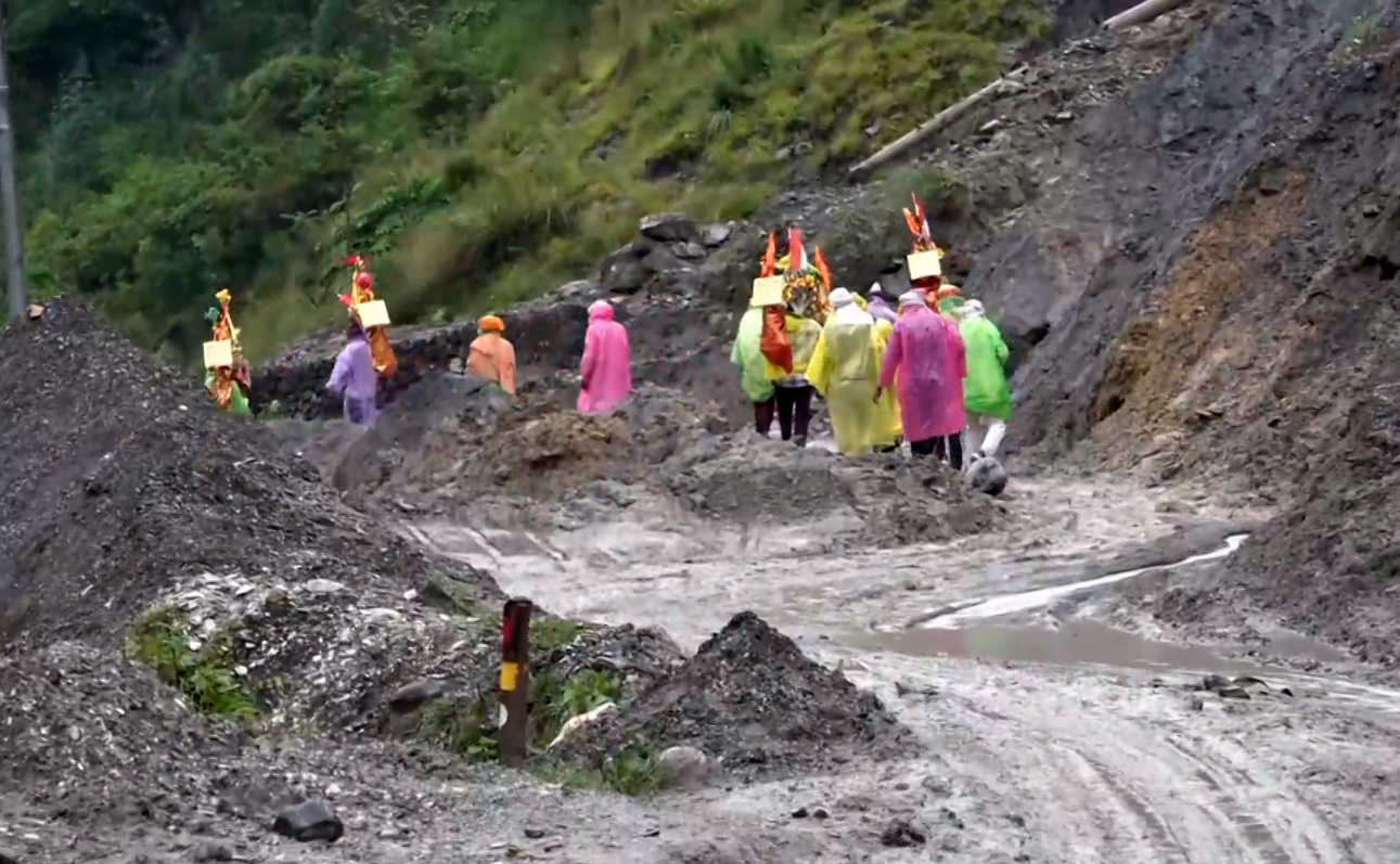 **EDS: SCREENSHOT VIA PTI VIDEOS** Uttarkashi: 'Kanwariyas' returning from Gangotri make their way through a damaged road in flash flood-hit Dharali area, in Uttarkashi district, Uttarakhand, Wednesday, Aug. 6, 2025. (PTI Photo)(PTI08_06_2025_000007B)