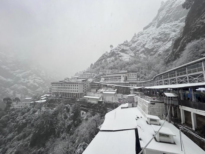Katra: A view of snow-covered 'Shri Mata Vaishno Devi Bhawan' following fresh snowfall, in Katra, Reasi district, Jammu and Kashmir, Friday, Jan. 23, 2026. (PTI Photo) (PTI01_23_2026_000174B)