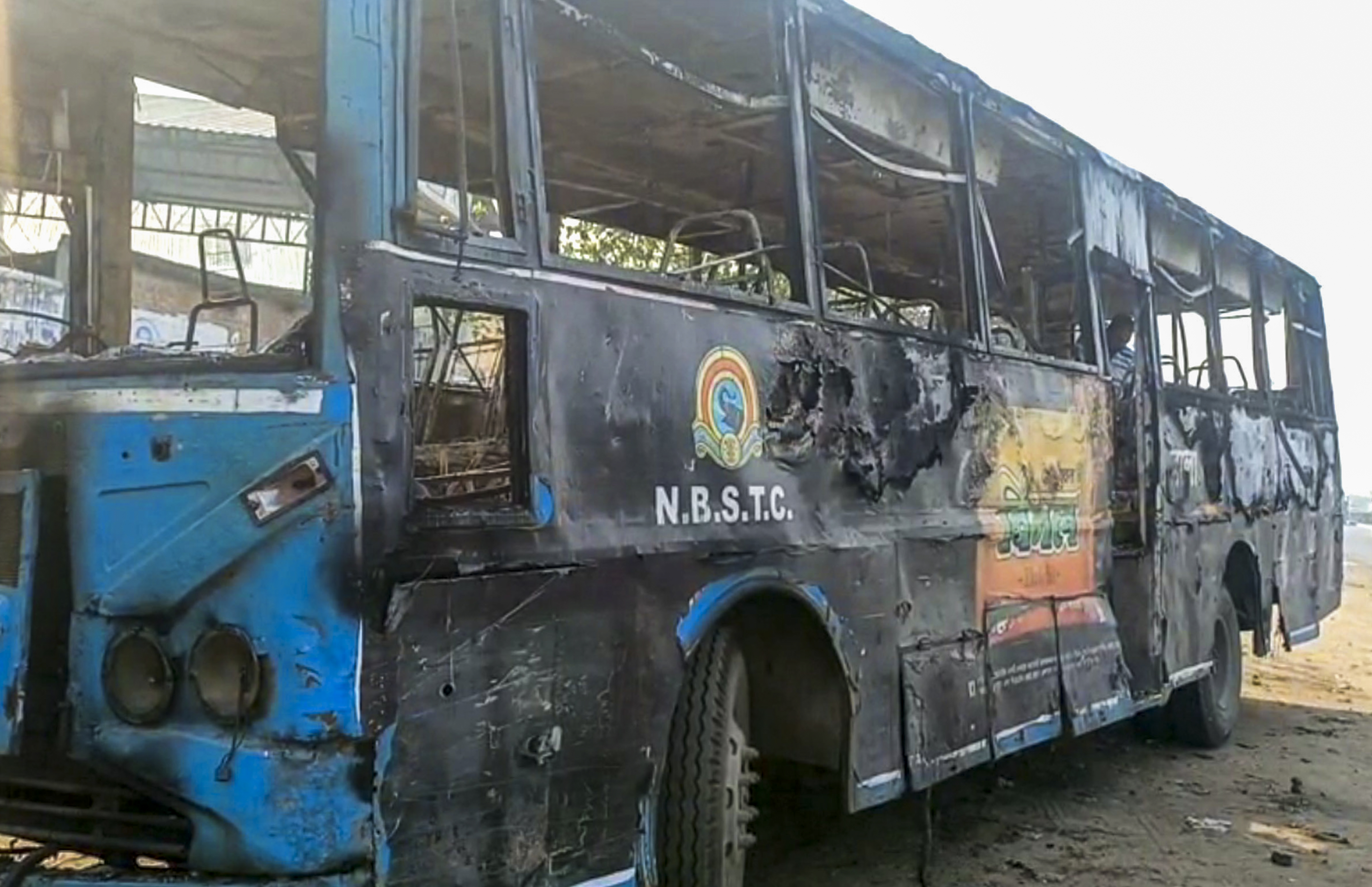 Murshidabad: A charred bus after violent clashes following protests over Waqf Act at Jangipur, in Murshidabad district, Saturday, April 12, 2025. (PTI Photo) (PTI04_12_2025_000191B) *** Local Caption ***