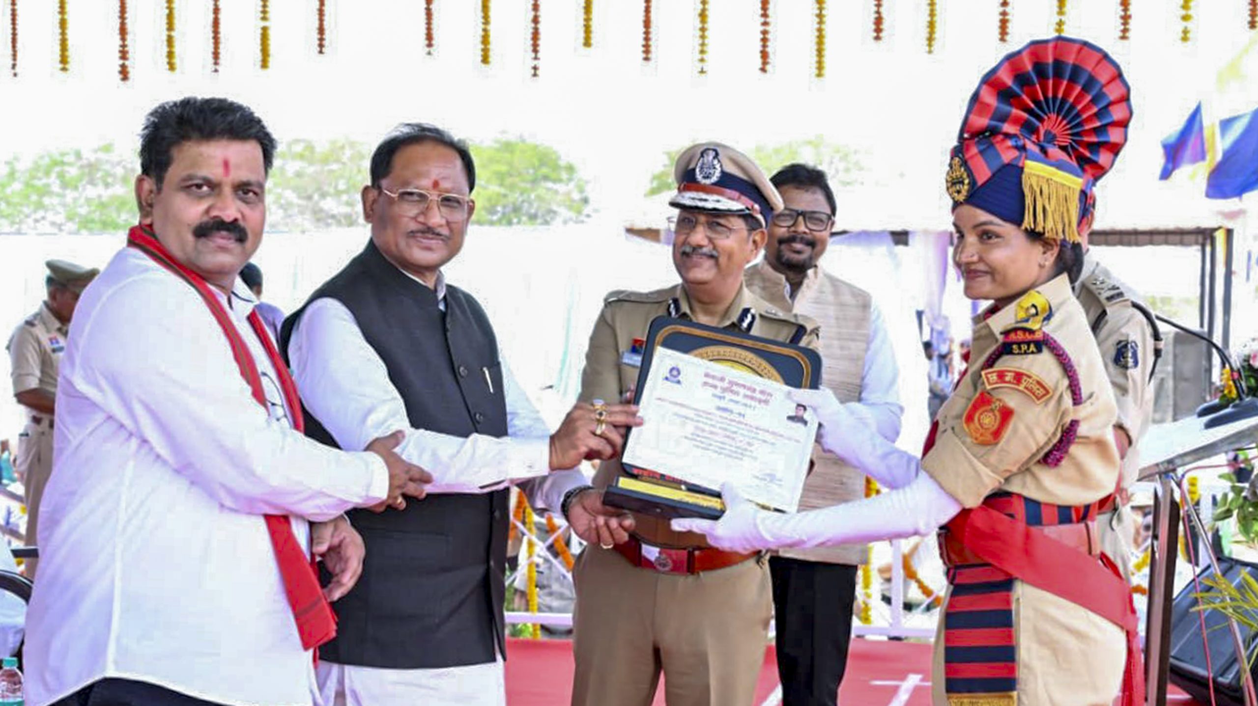 **EDS: THIRD PARTY IMAGE** In this image received on March 31, 2026, Chhattisgarh Chief Minister Vishnu Deo Sai presents certificates to trainee officers during the passing-out parade at Netaji Subhash Chandra Bose State Police Academy, in Chandkhuri, Raipur district of Chhattisgarh. (CMO via PTI Photo)(PTI03_31_2026_000209B)