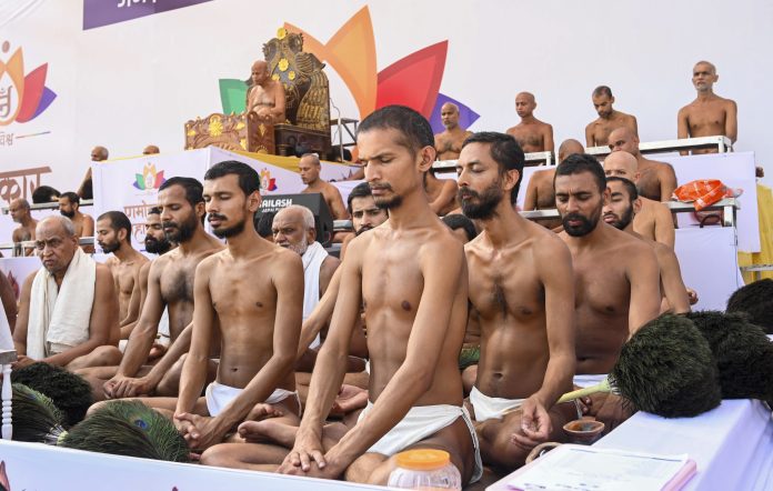 Jabalpur: Jain Munis (Monks) take part in an event of ‘Vishwa Navkar Mahamantra Day’, in Jabalpur, Wednesday, April 9, 2025. (PTI Photo) (PTI04_09_2025_000158B)