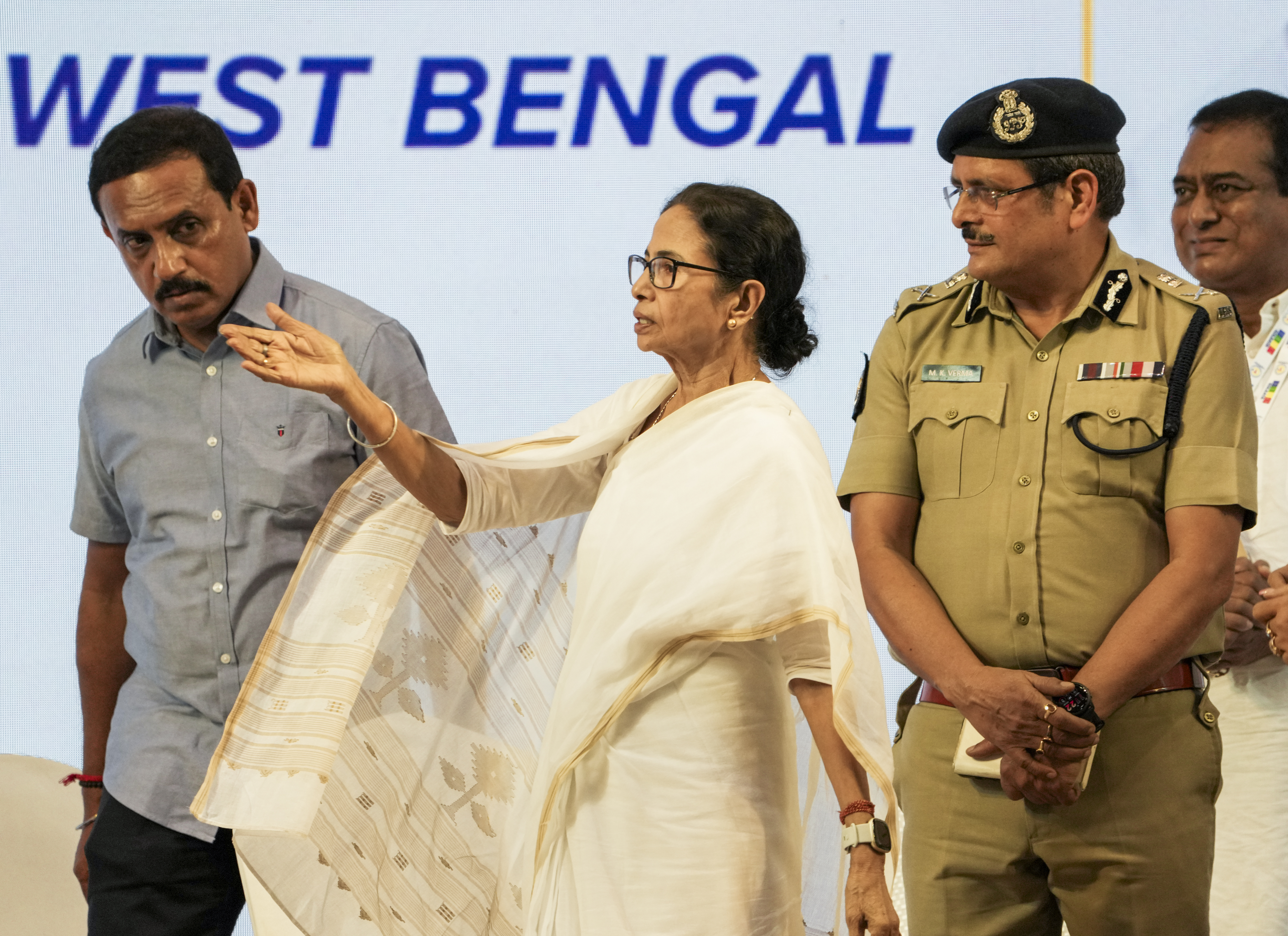 Kolkata: West Bengal Chief Minister Mamata Banerjee and Kolkata Police Commissioner Manoj Kumar Verma during a ‘Vishwa Navkar Mahamantra Diwas’ event, dedicated to collective chanting of the ‘mantra’ for universal harmony and peace, at Netaji Indoor Stadium, in Kolkata,West Bengal, Wednesday, April 9, 2025. (PTI Photo/Swapan Mahapatra) (PTI04_09_2025_000172B)
