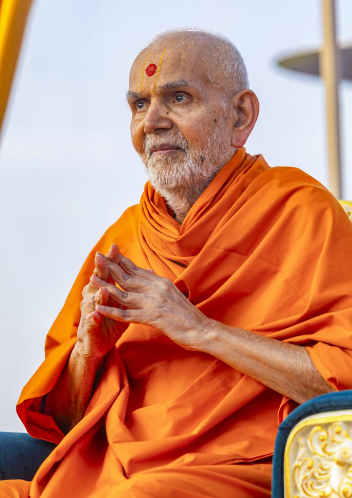 **EDS: THIRD PARTY IMAGE** In this image received on March 25, 2026, BAPS President Mahant Swami Maharaj during a ‘Vishwa Shanti Mahayagna’ organised as part of the ‘Tapamurti Shri Neelkanthvarni Murti Pratishtha Mahotsav’, at the Akshardham Temple, in New Delhi. (Handout via PTI Photo) (PTI03_25_2026_000408B) *** Local Caption ***