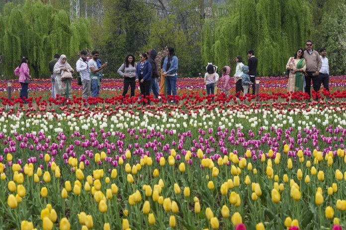 Srinagar: Visitors at the Tulip Garden in full bloom at the foothills of the Zabarwan mountains overlooking Dal Lake, in Srinagar, Wednesday, April 9, 2025. (PTI Photo/S Irfan) (PTI04_09_2025_000225B)
