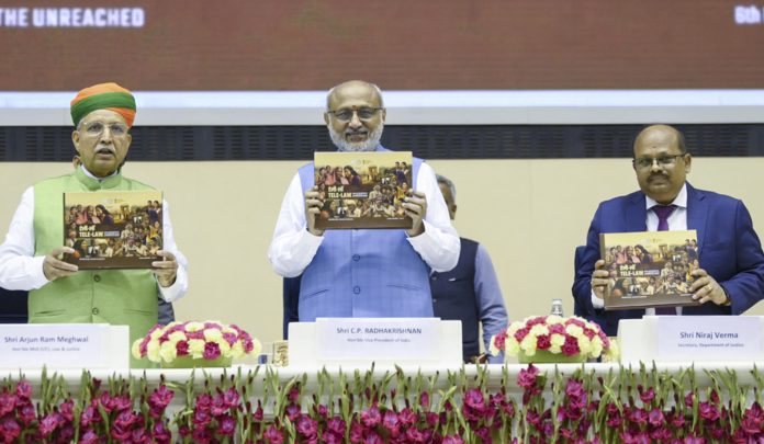 **EDS: THIRD PARTY IMAGE** In this image posted on March 29, 2026, Vice President CP Radhakrishnan, Union Law Minister Arjun Ram Meghwal and others during the National Consultation on Tele-Law initiative, organised by the Ministry of Law and Justice under the DISHA scheme, in New Delhi. (@VPIndia/X via PTI Photo) (PTI03_29_2026_000306B)
