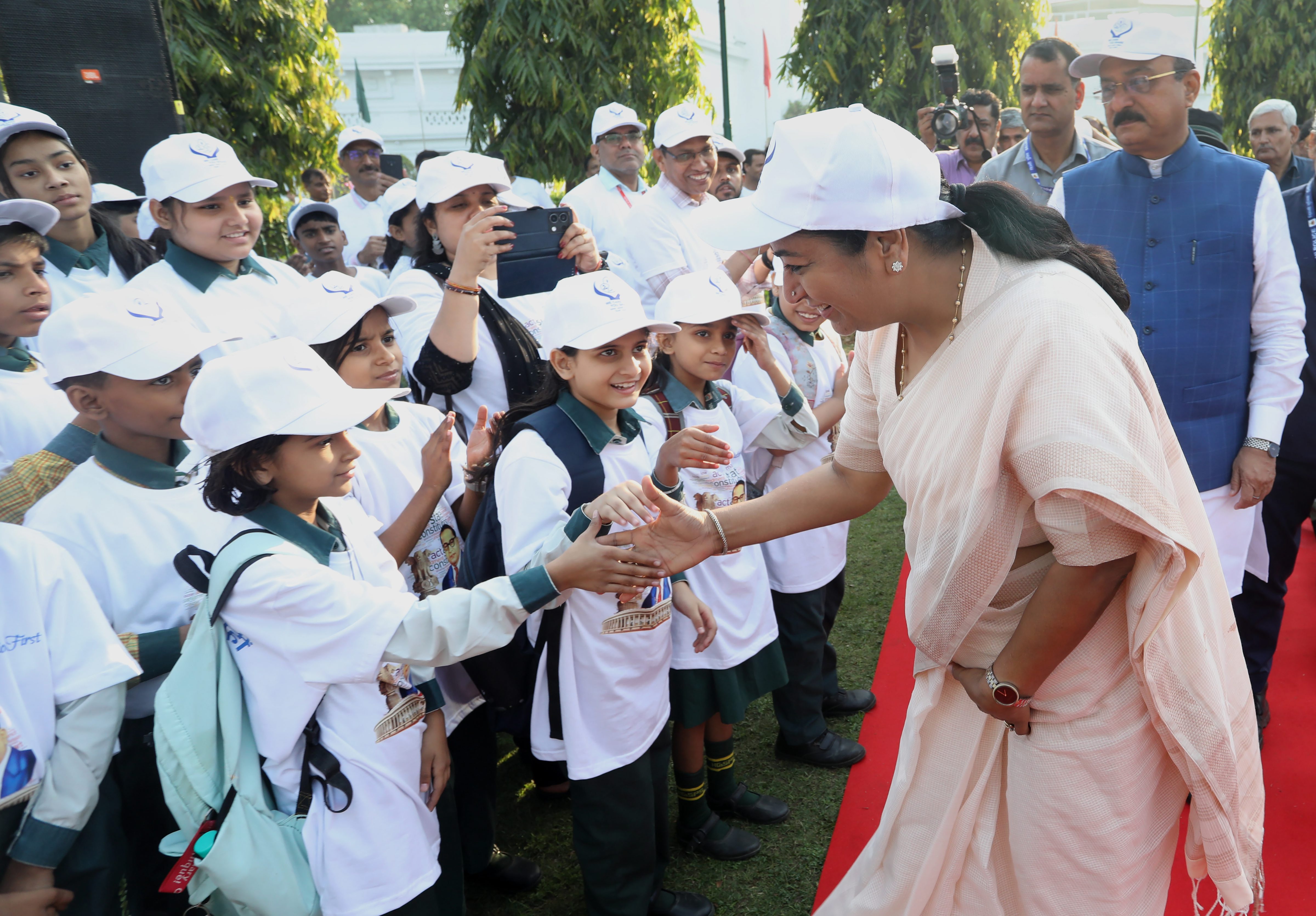 New Delhi: Delhi Chief Minister Rekha Gupta meets school children before flagging off Walkathon 2025 on the occasion of 134th birth anniversary of Dr B R Ambedkar at Delhi Vidhan Sabha in New Delhi, Sunday, April 14, 2025. (PTI Photo) (PTI04_13_2025_000044B)