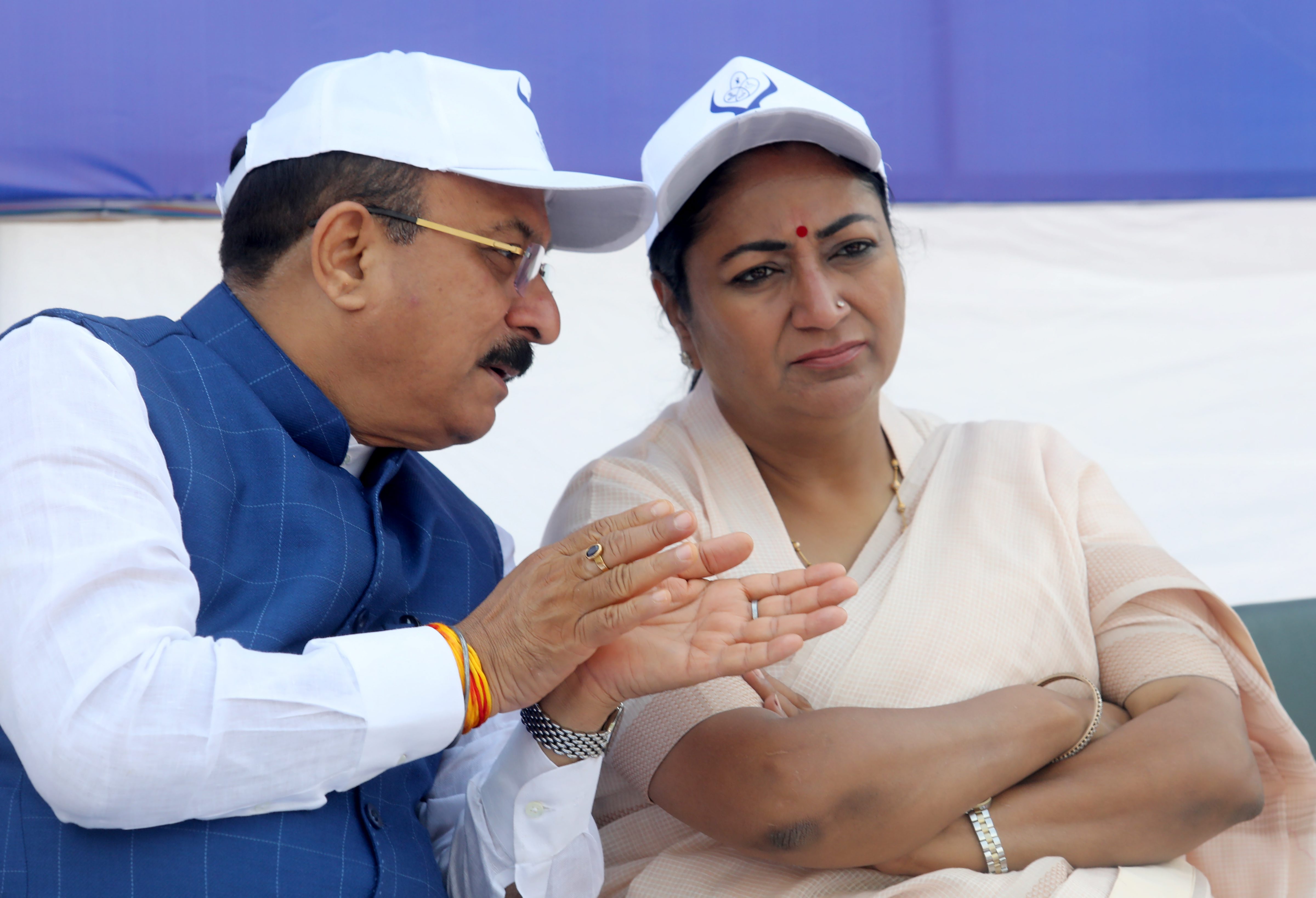 New Delhi: Delhi Chief Minister Rekha Gupta with Education Minister Ashish Sood during the Walkathon 2025 event organised on the occasion of 134th birth anniversary of Dr B R Ambedkar at Delhi Vidhan Sabha in New Delhi, Sunday, April 14, 2025. (PTI Photo) (PTI04_13_2025_000047B)