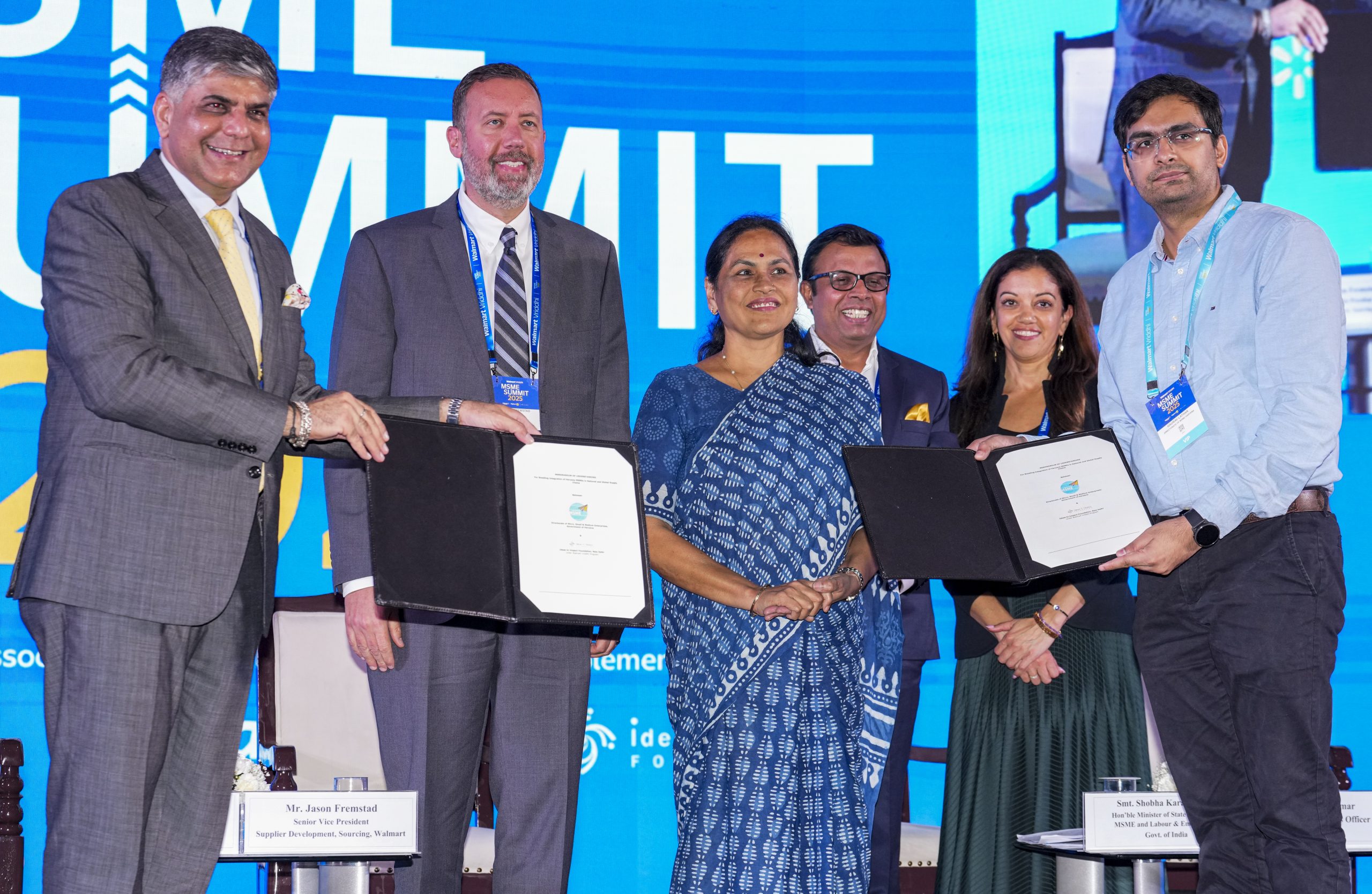 New Delhi: Union Minister of State for MSME and Labour & Employment Shobha Karandlaje and Jason Fremstad, Senior Vice President of Supplier Development, Sourcing, Walmart International, witness exchange of MoU during Walmart Vriddhi MSME Summit 2025, in New Delhi, Thursday, June 19, 2025. (PTI Photo/Kamal Kishore) (PTI06_19_2025_000064B)