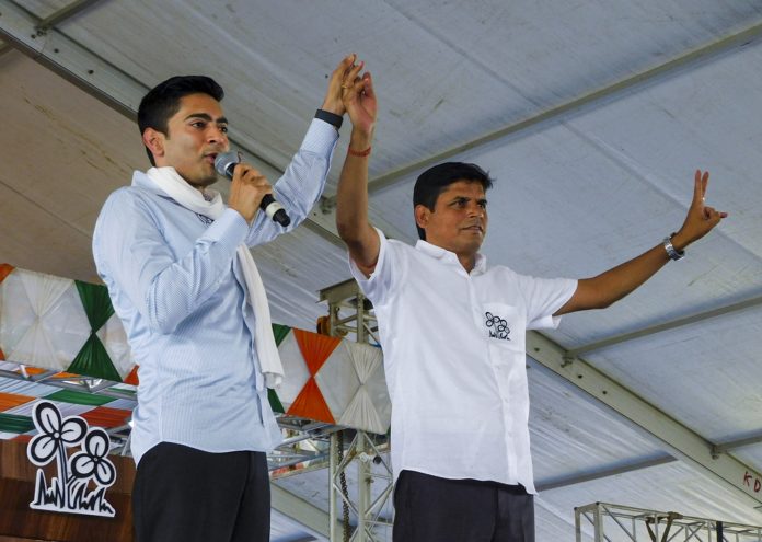 Bankura: All India Trinamool Congress General Secretary and MP Abhishek Banerjee, left, addresses a public rally in support of party candidate for Taldangra constituency, Falguni Singhababu, right, ahead of the West Bengal Assembly Election, in Bankura district, Thursday, April 2, 2026. (PTI Photo)(PTI04_02_2026_000169B)