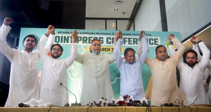 Kolkata: All India Majlis-e-Ittehadul Muslimeen (AIMIM) President Asaduddin Owaisi joins hands with Aam Janata Unnayan Party (AJUP) Chief Humayun Kabir during a press conference, in Kolkata, Wednesday, March 25, 2026. AIMIM has joined hands with AJUP ahead of the West Bengal Assembly elections. (PTI Photo)(PTI03_25_2026_000157B)