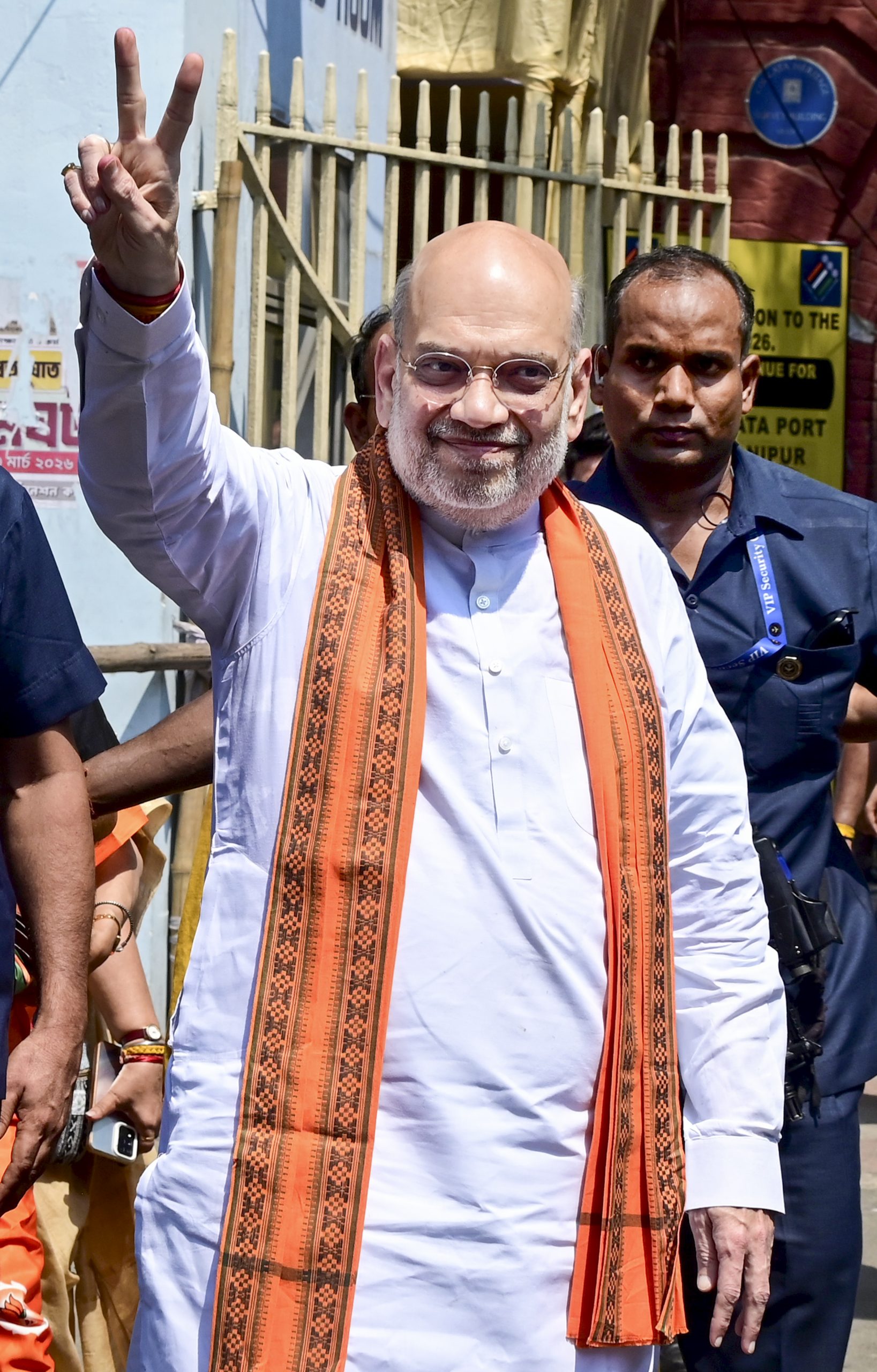 Kolkata: Union Home Minister Amit Shah shows a victory sign after the nomination submission of BJP candidate for Bhabanipur and Nandigram Assembly constituencies, Suvendu Adhikari, unseen, ahead of the West Bengal Assembly elections, in Kolkata, Thursday, April 2, 2026. (PTI Photo) (PTI04_02_2026_000197B)