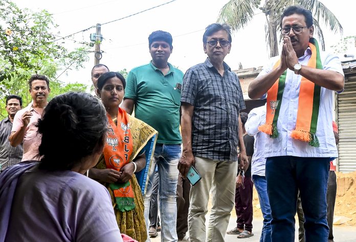Nadia: BJP candidate Subrata Kabiraj campaigns for the Tehatta Assembly constituency ahead of the state Assembly elections, in Nadia, West Bengal, Sunday, March 29, 2026. (PTI Photo)(PTI03_29_2026_000037B)