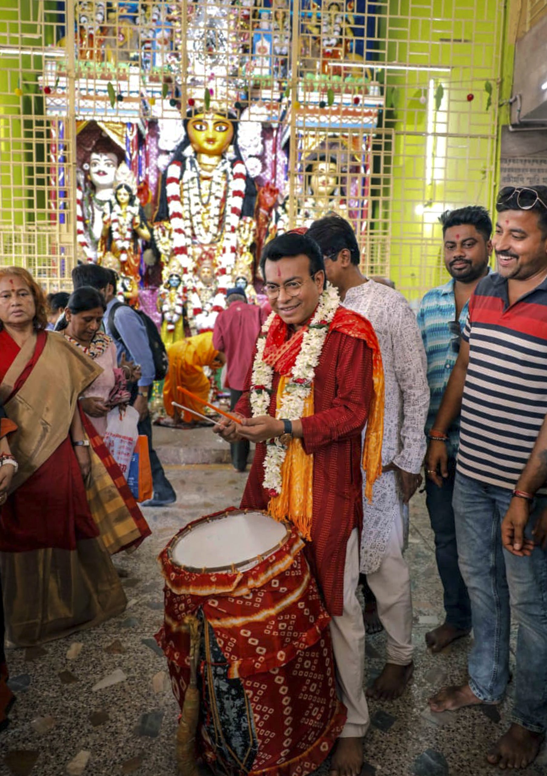 Howrah: BJP candidate Rudranil Ghosh, centre, from Shibpur Assembly constituency plays ‘dhaak’ as he offers prayers at Ichapur Somichanditala Baroyari Temple ahead of West Bengal Assembly Elections, in Howrah, Wednesday, March 25, 2026. (PTI Photo)(PTI03_25_2026_000234B)