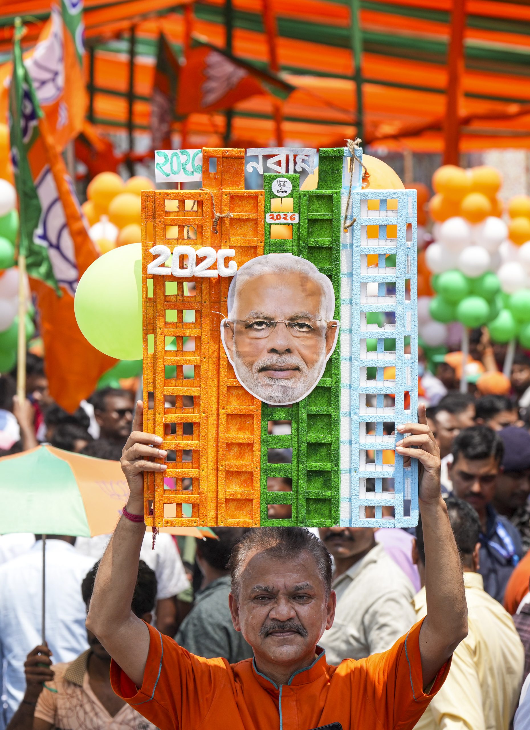 Kolkata: A BJP supporter holds a placard of Prime Minister Narendra Modi during a roadshow for filing nomination papers, in Kolkata, West Bengal, Thursday, April 2, 2026. (PTI Photo/Swapan Mahapatra)(PTI04_02_2026_000127B)