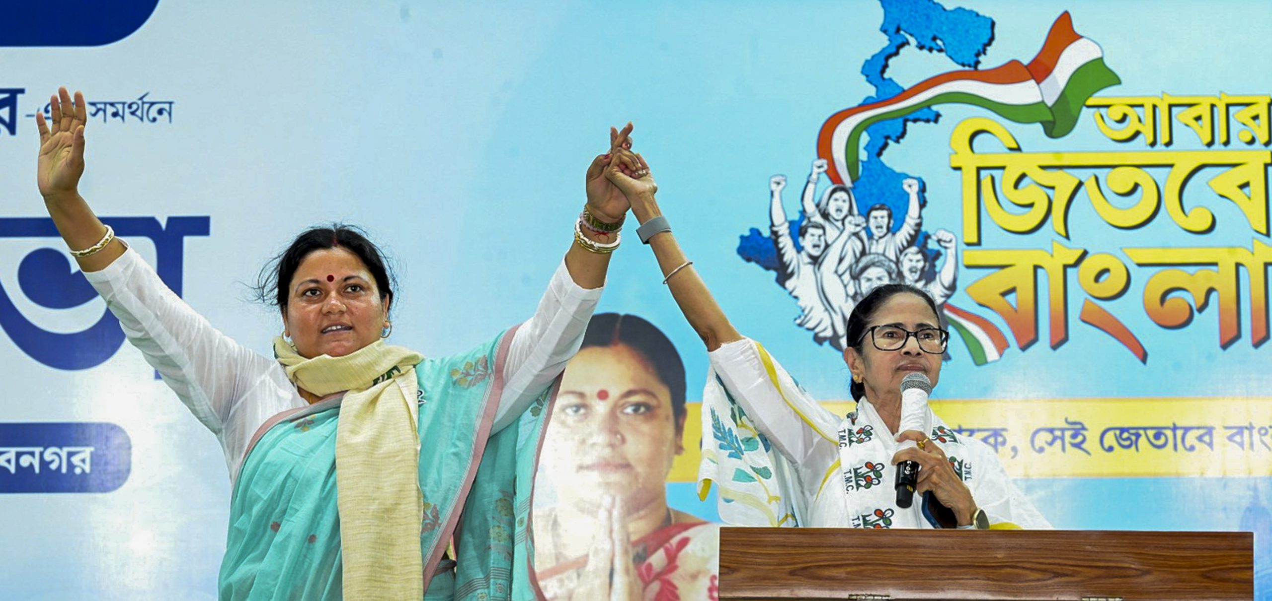 **EDS: THIRD PARTY IMAGE** In this image received on April 2, 2026, West Bengal Chief Minister Mamata Banerjee, right, addresses a public rally in support of the party candidate for Baisnabnagar constituency, Chandana Sarkar, left, ahead of the state assembly elections, in Malda district. (West Bengal CMO via PTI Photo)(PTI04_02_2026_000236B)