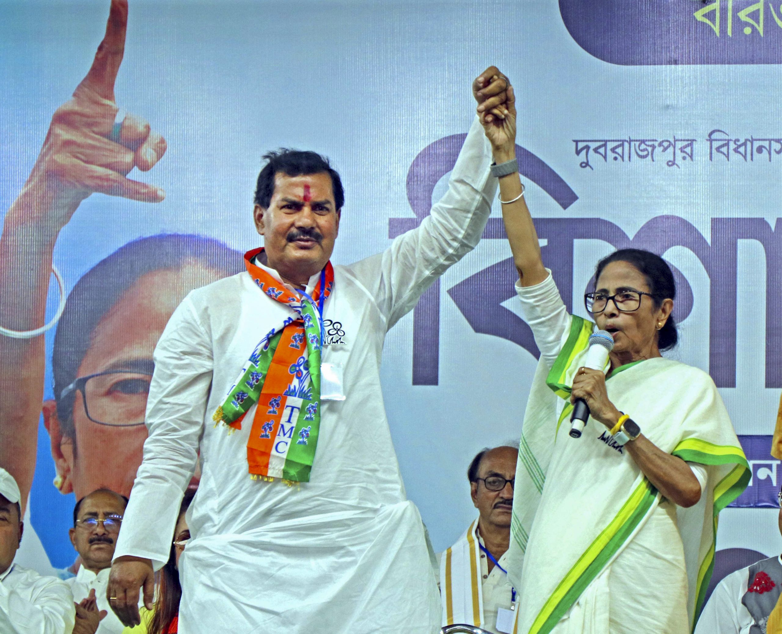 Birbhum: West Bengal Chief Minister Mamata Banerjee with TMC candidate from Dubrajpur constituency, Naresh Chandra Bauri, during a public rally ahead of the state Assembly elections, in Birbhum, Thursday, March 26, 2026. (PTI Photo) (PTI03_26_2026_000396B)