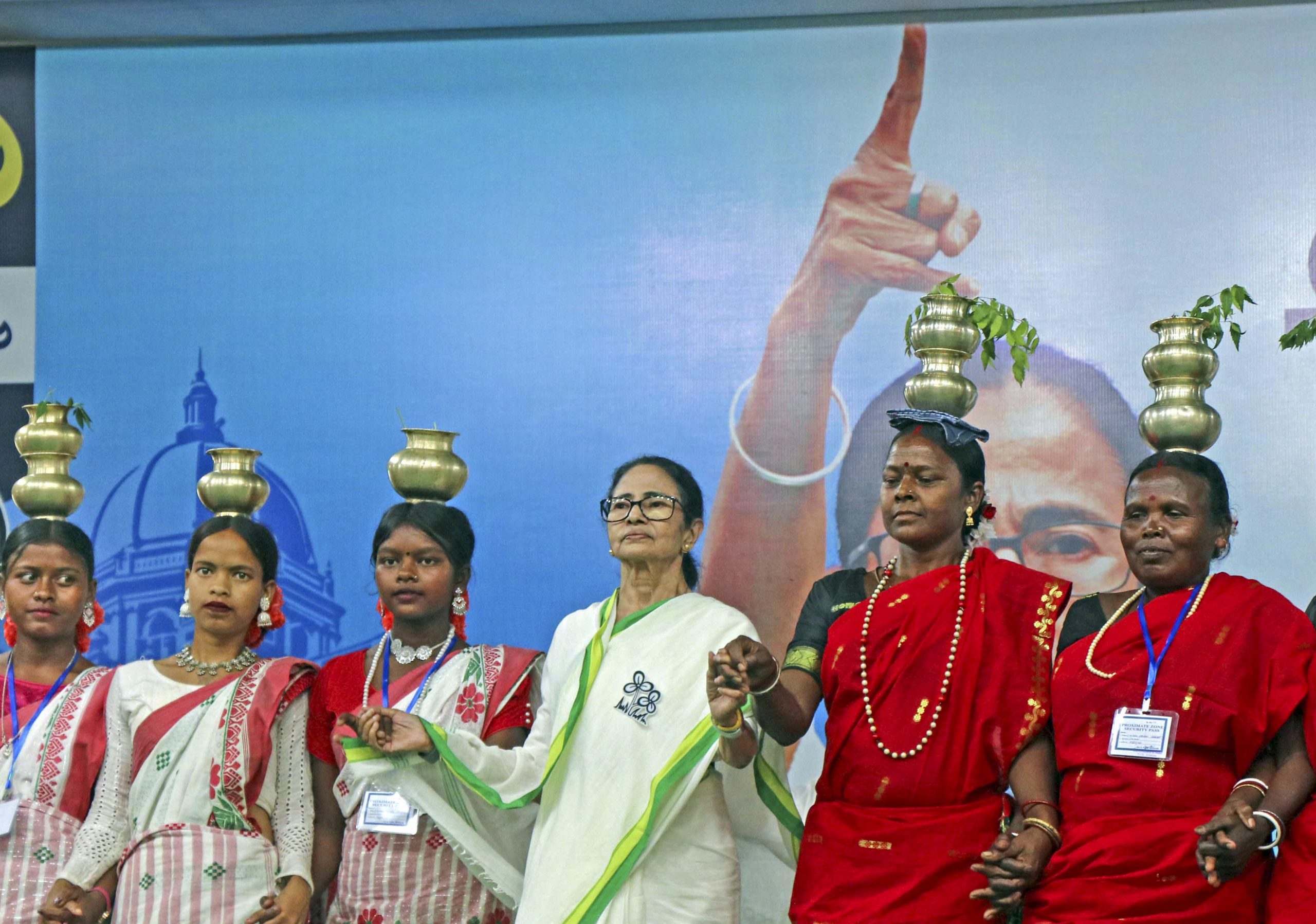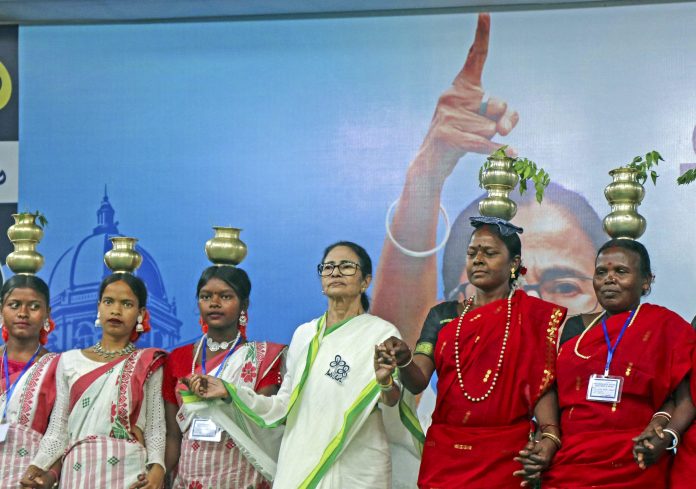 Birbhum: West Bengal Chief Minister Mamata Banerjee with artists during a public rally in support of TMC candidate from Dubrajpur constituency, Naresh Chandra Bauri, unseen, ahead of the state Assembly elections, in Birbhum, Thursday, March 26, 2026. (PTI Photo) (PTI03_26_2026_000398B)