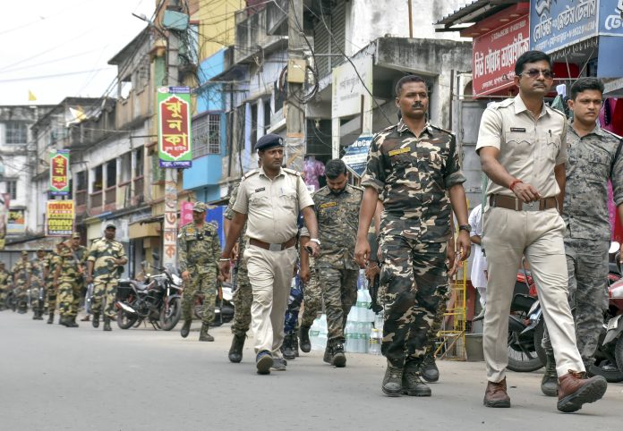 Murshidabad: Security personnel patrol as a safety measure ahead of the West Bengal Assembly elections, in Murshidabad, Saturday, March 28, 2026. (PTI Photo)(PTI03_28_2026_000127B)