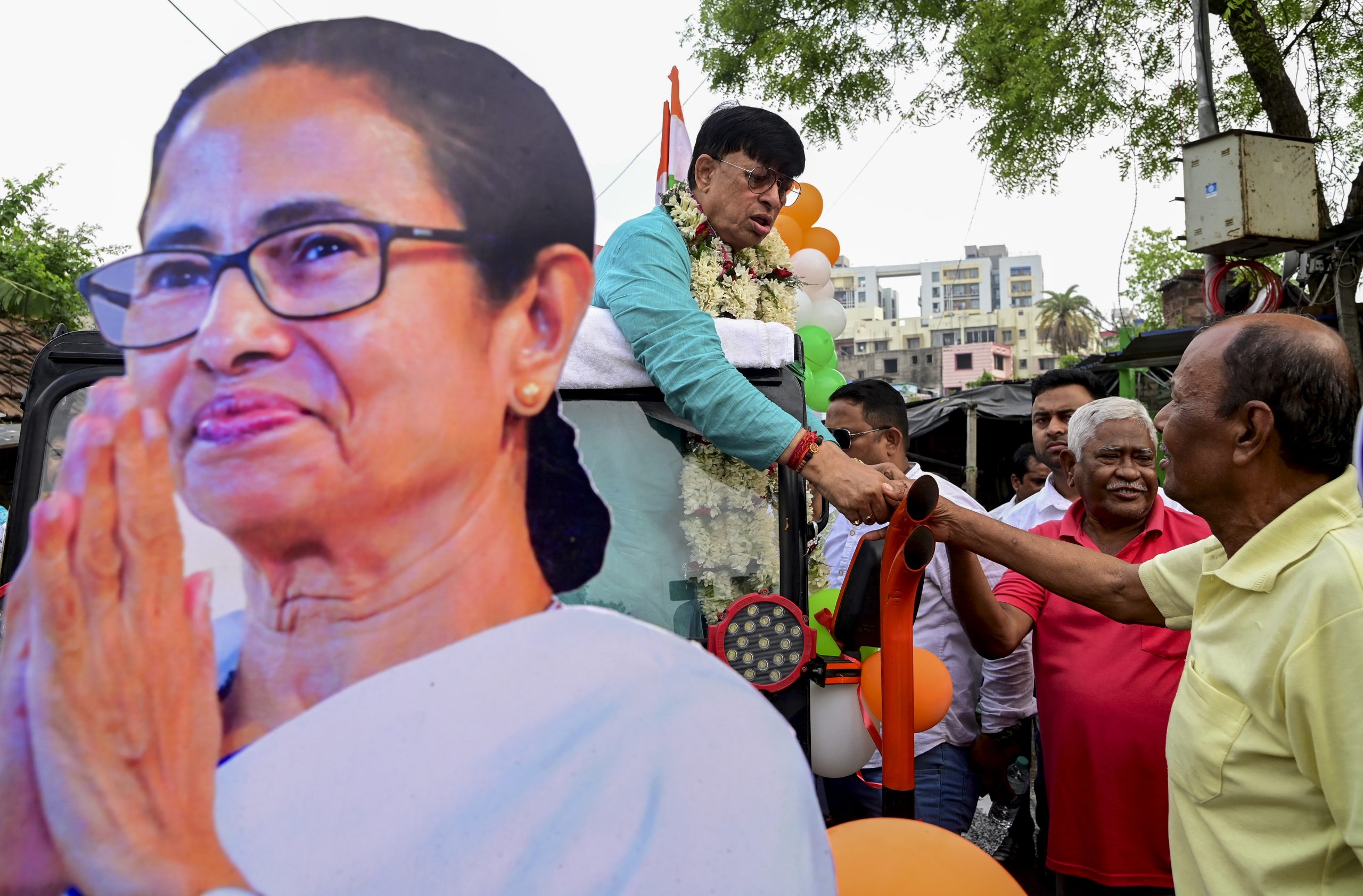 Kolkata: TMC candidate Subhasish Chakraborty for Behala Purba Assembly constituency greets supporters during his election campaign at Kabardanga, in Kolkata, Monday, March 30, 2026. (PTI Photo)(PTI03_30_2026_000011B)