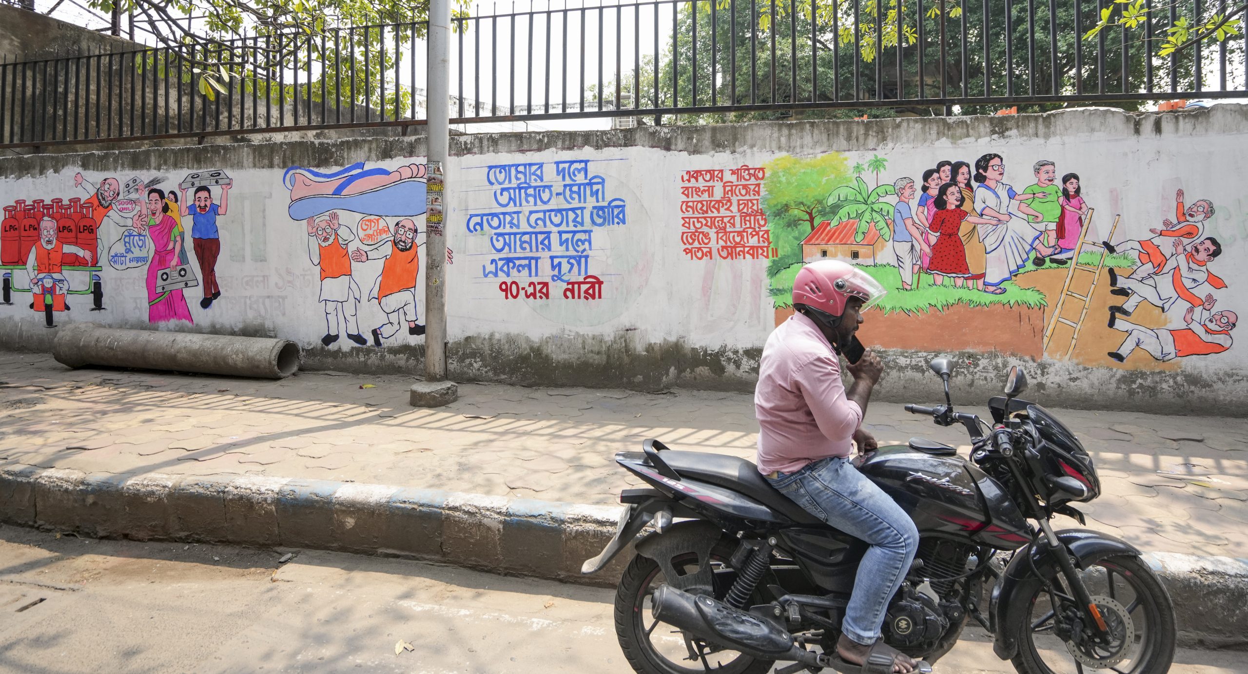 Kolkata: A commuter stands at a roadside near a wall graffiti as part of TMC’s campaign for the upcoming West Bengal Assembly elections, in Kolkata, Wednesday, March 25, 2026. (PTI Photo/Swapan Mahapatra) (PTI03_25_2026_000196B)
