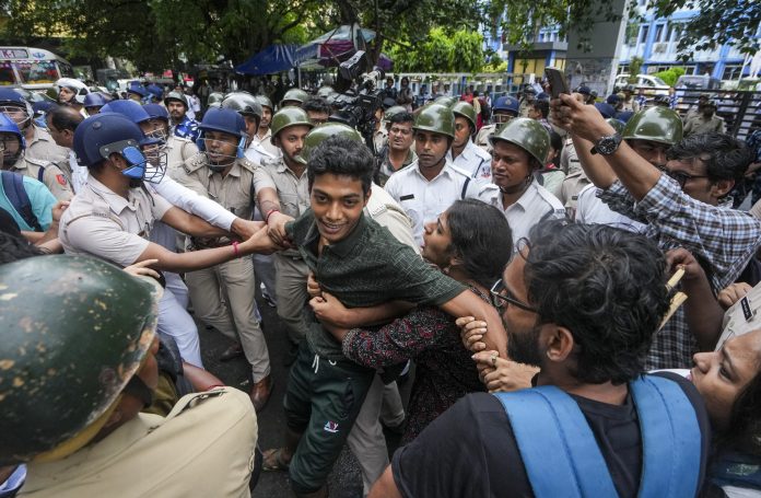 Kolkata: Members of Students' Federation of India being detained during their protest over the delay in publication of West Bengal Joint Entrance Examinations (WBJEE) results, outside Bikash Bhawan, in Kolkata, Tuesday, Aug. 19, 2025. (PTI Photo/Swapan Mahapatra)(PTI08_19_2025_000205B)