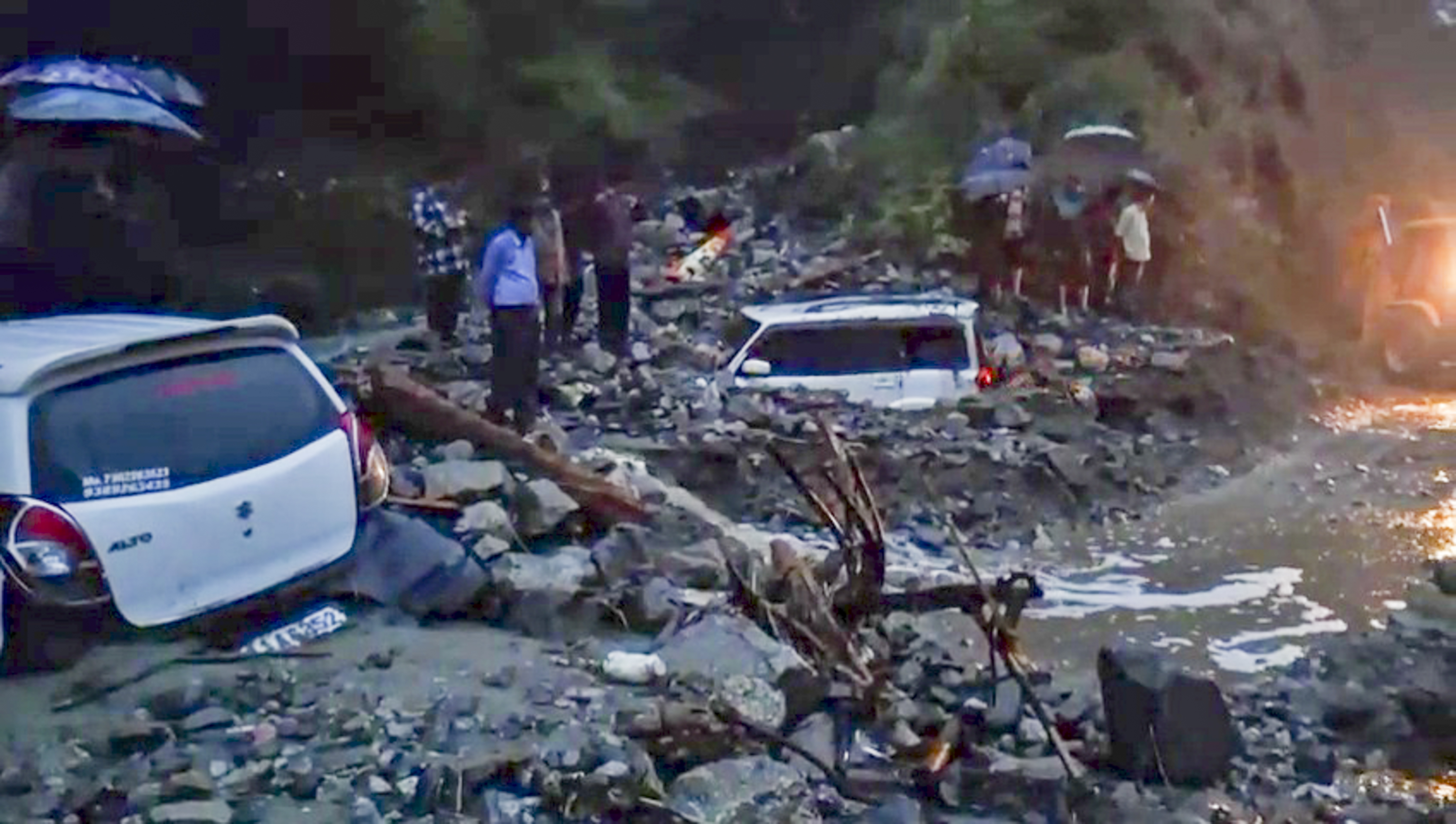 Chamoli: Vehicles stuck in the debris after heavy torrential rains at Tharali in Chamoli district, early Thursday, April 10, 2025. (PTI Photo) (PTI04_10_2025_000030B)