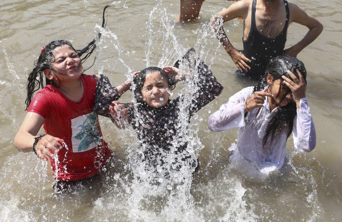 Jammu: Children take bath in the Ranbir canal to cool off on a hot summer day, in Jammu, Sunday, April 13, 2025. (PTI Photo) (PTI04_13_2025_000178B)