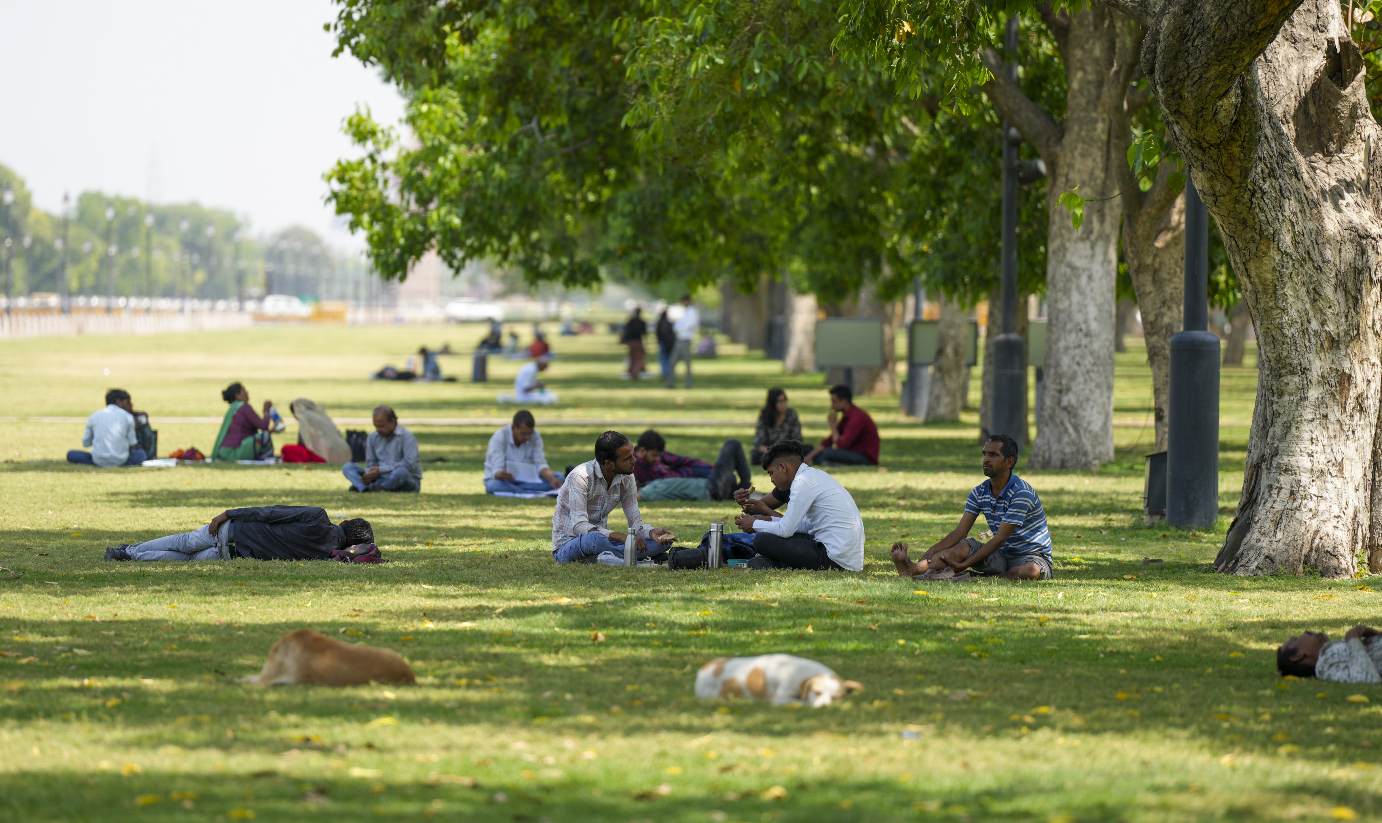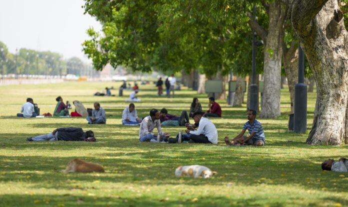 New Delhi: People take rest under a tree on a hot summer day at the Kartavya Path lawn, in New Delhi, Monday, April 7, 2025. The India Meteorological Department (IMD) has issued a yellow alert for the city, forecasting a heatwave to persist until Wednesday. (PTI Photo/Vijay Verma)(PTI04_07_2025_000163B)
