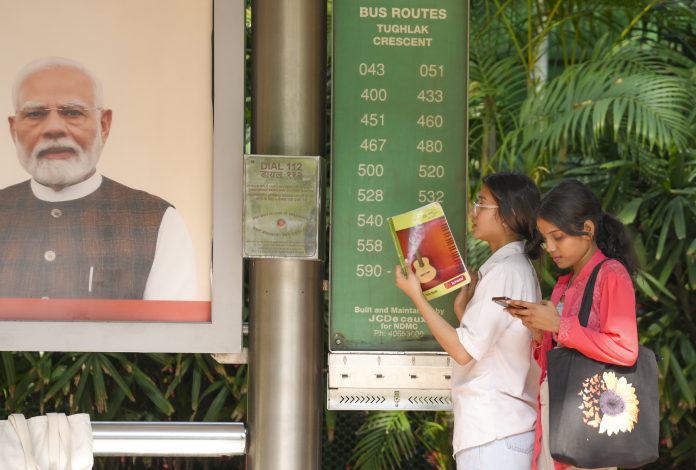 New Delhi: A passenger uses a book to beat the heat while waiting at a bus stop, in New Delhi, Monday, April 7, 2025. The India Meteorological Department (IMD) has issued a yellow alert for the city, forecasting a heatwave to persist until Wednesday. (PTI Photo/Vijay Verma)(PTI04_07_2025_000154B)