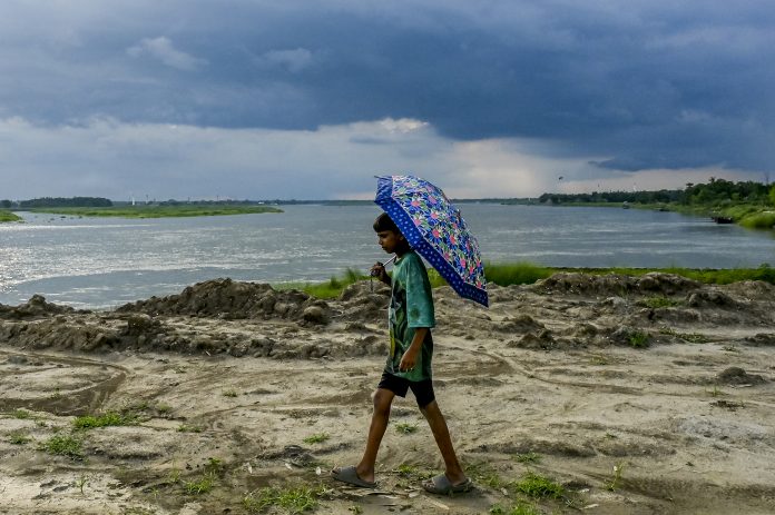 Nadia: A child walks by a riverbank as dark clouds cover the skyline, in Nadia, West Bengal, Saturday, March 28, 2026. (PTI Photo) (PTI03_28_2026_000403B)