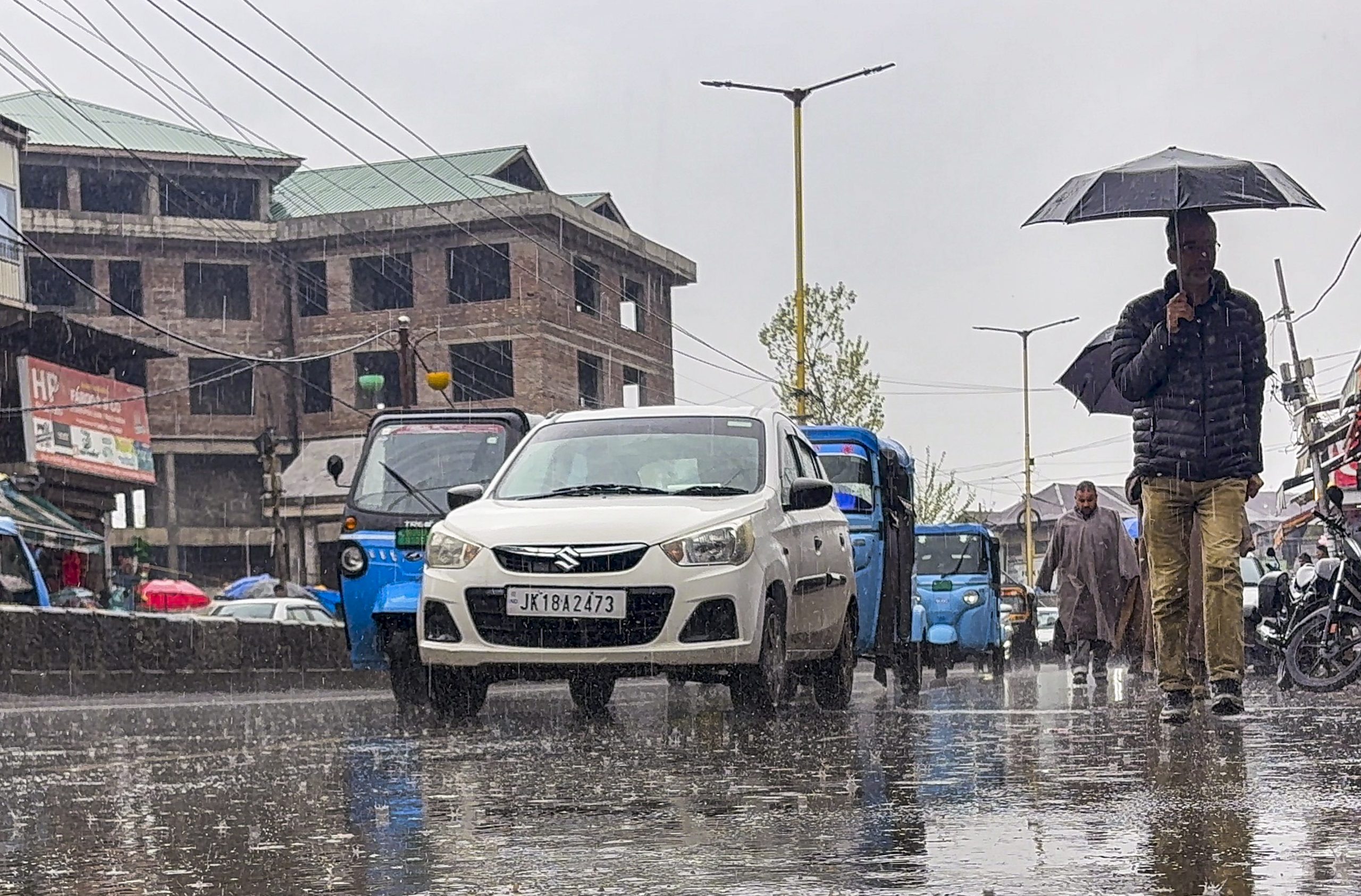 Anantnag: People walk with umbrellas as vehicles ply on a rain-soaked road during rainfall, in Anantnag, Jammu and Kashmir, Monday, March 30, 2026. (PTI Photo)(PTI03_30_2026_000218B)