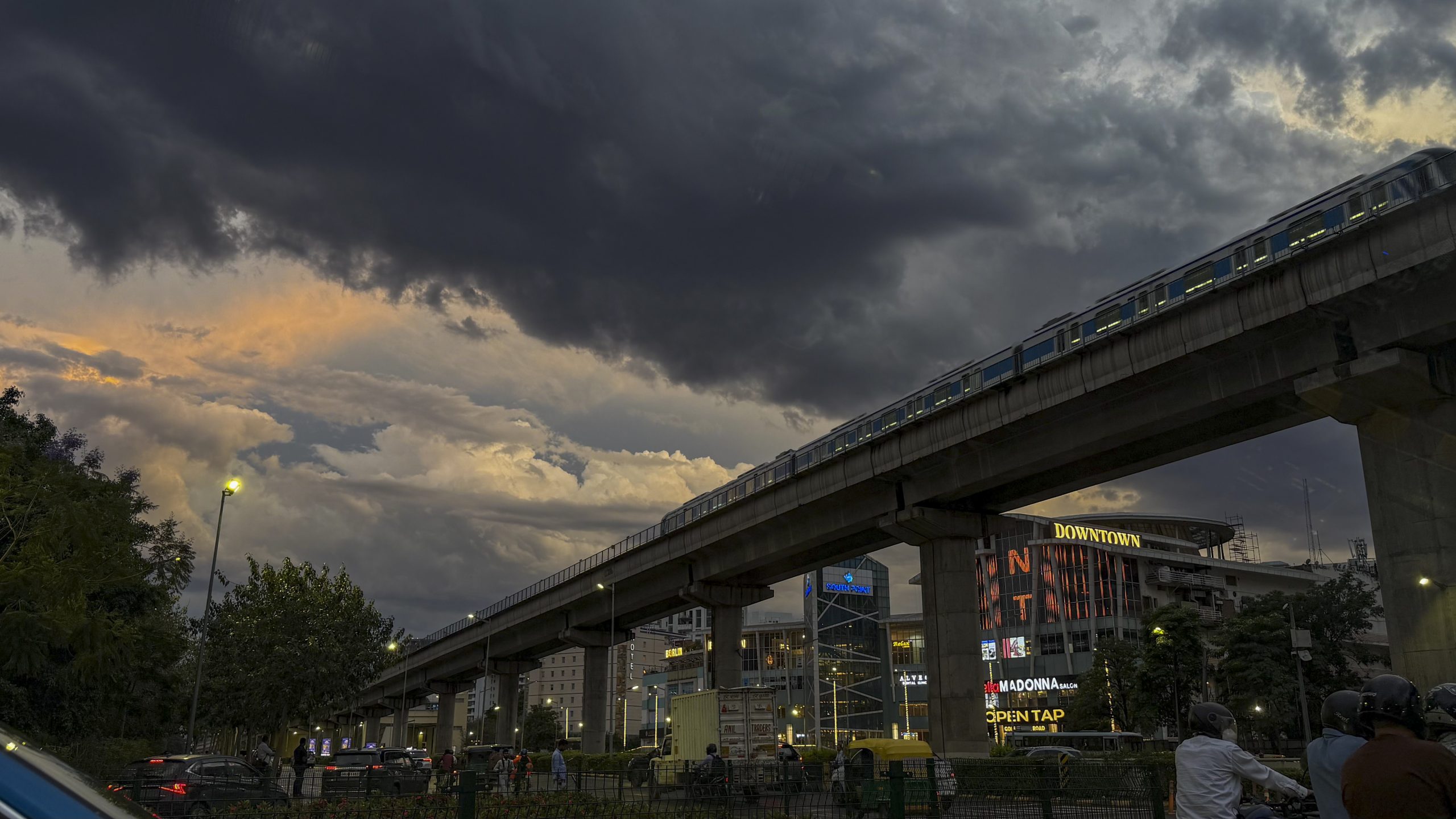 Gurugram: A metro train passes by as rain clouds fill the evening sky, in Gurugram, Tuesday, March 31, 2026. (PTI Photo) (PTI03_31_2026_000289B)