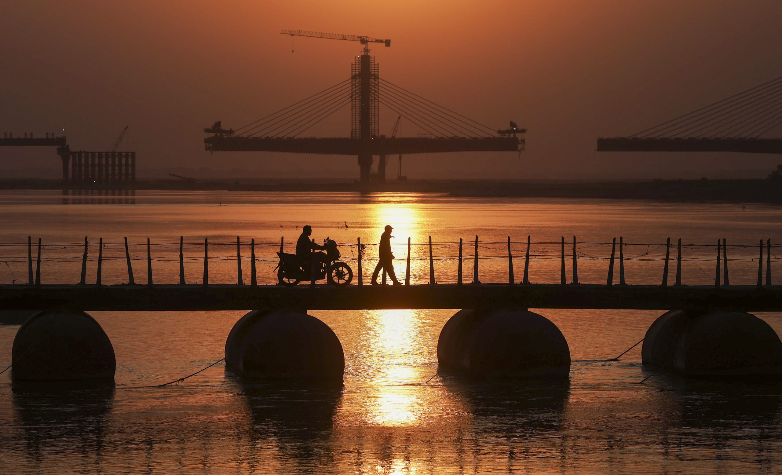 Prayagraj: People walk on a pontoon bridge over the Ganga river during sunset, in Prayagraj, Thursday, March 26, 2026. (PTI Photo) (PTI03_26_2026_000363B) *** Local Caption ***