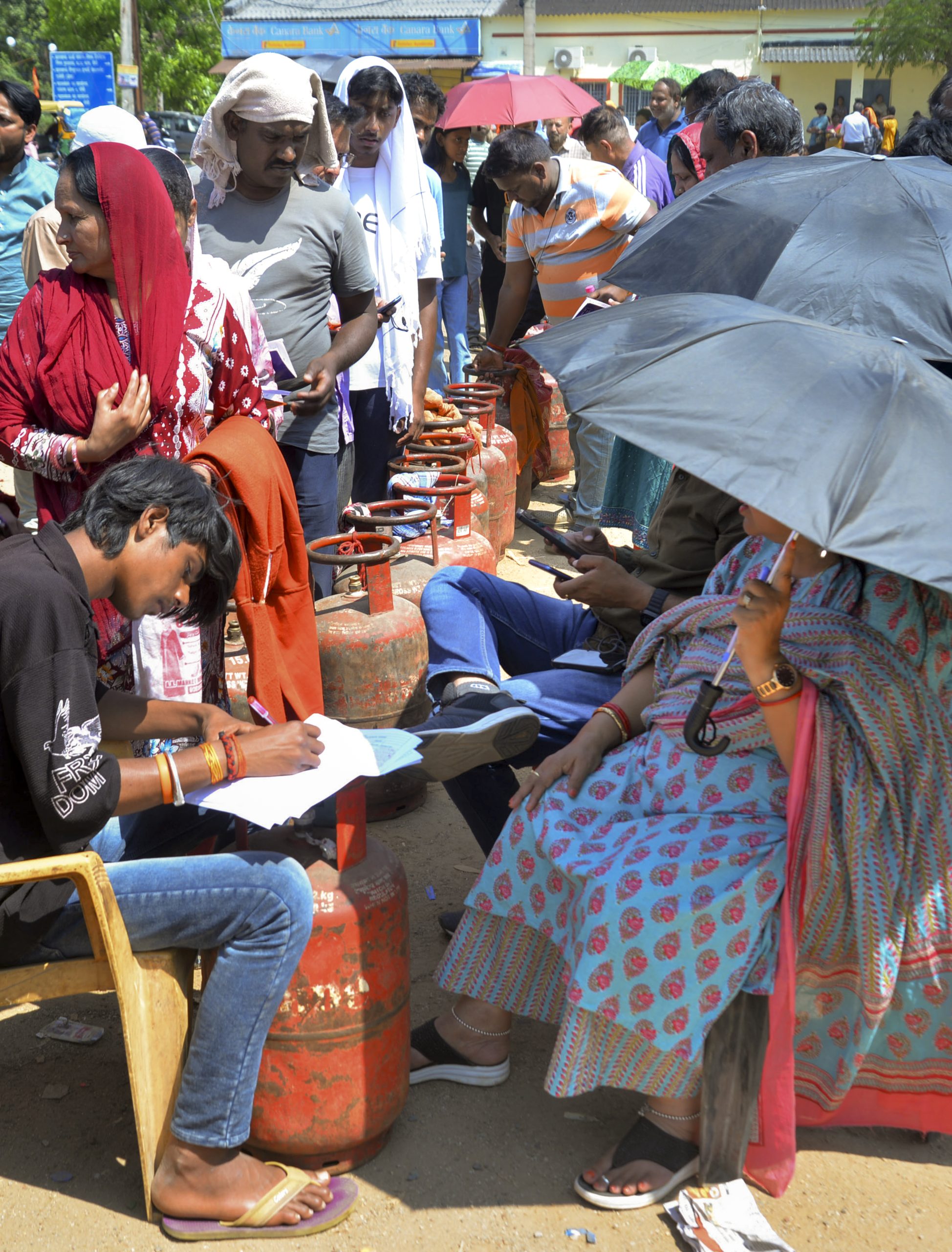 Ranchi: A worker distributes refilled LPG cylinders as people wait in a queue with the empty ones amid ongoing supply disruptions, in Ranchi, Jharkhand, Thursday, March 26,2026. (PTI Photo)(PTI03_26_2026_000085B)