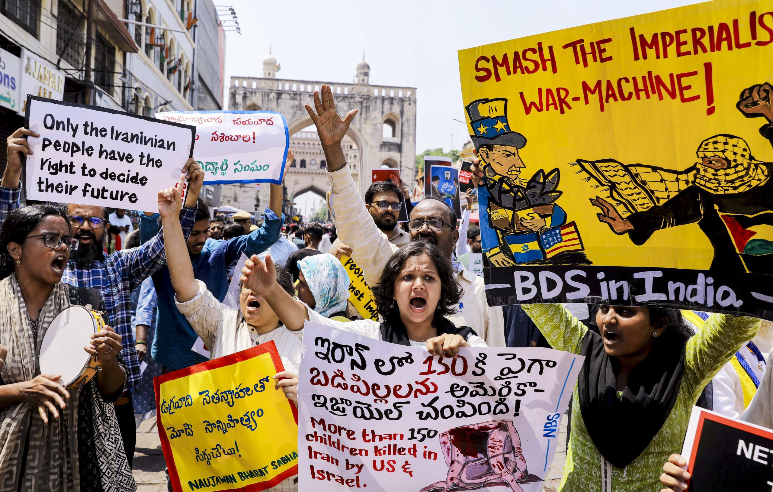 Hyderabad: Activists hold placards during a protest rally against the ongoing West Asia conflict, near Charminar in Hyderabad, Telangana, Sunday, March 29, 2026. (PTI Photo)(PTI03_29_2026_000099B)