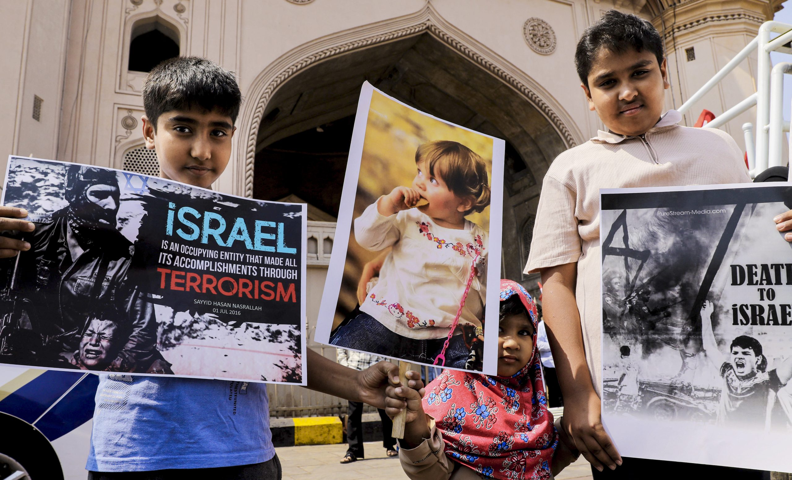 Hyderabad: Children hold placards during a protest rally against the ongoing West Asia conflict, near Charminar in Hyderabad, Telangana, Sunday, March 29, 2026. (PTI Photo)(PTI03_29_2026_000097B)