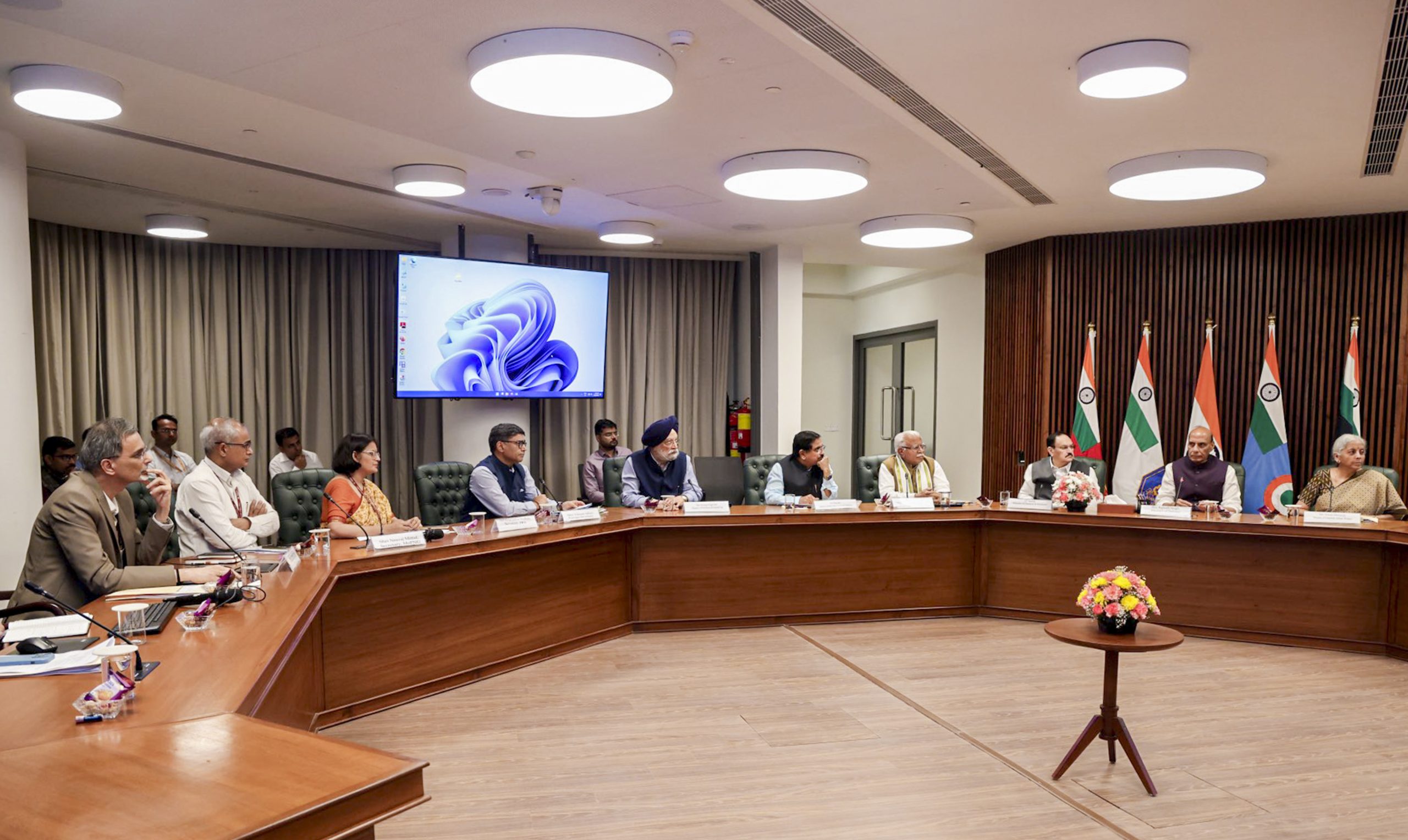 **EDS: THIRD PARTY IMAGE; TO GO WITH STORY** In this image posted on March 28, 2026, Union Defence Minister Rajnath Singh, Union Health Minister JP Nadda and Union Finance Minister Nirmala Sitharaman with others during a meeting of an Informal Group of Ministers (IGoM) over the ongoing West Asia conflict, in New Delhi. (@rajnathsingh/X via PTI Photo) (PTI03_28_2026_000216B)