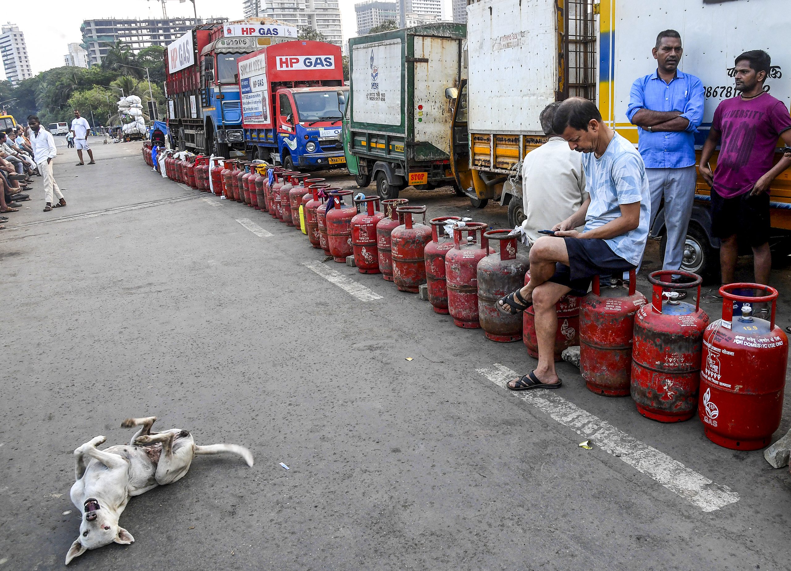 Mumbai: People wait with empty LPG cylinders to avail the refilled ones amid ongoing supply crunch, in Mumbai, Friday, March 27, 2026. (PTI Photo)(PTI03_27_2026_000067B)