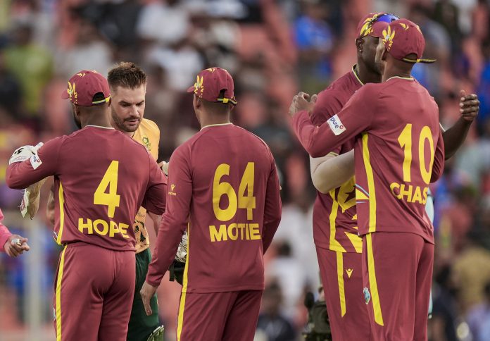 Ahmedabad: South Africa's captain Aiden Markram being greeted by West Indies' captain Shai Hope and others after the former's team won the ICC Men's T20 World Cup 2026 cricket match against West Indies, at Narendra Modi Stadium, in Ahmedabad, Thursday, Feb. 26, 2026. (PTI Photo/Kunal Patil)(PTI02_26_2026_000536B)