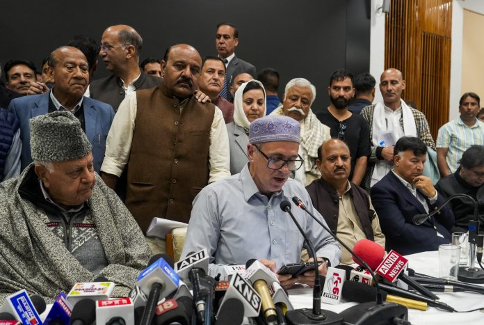 Srinagar: J&K Chief Minister Omar Abdullah with Deputy CM Surinder Kumar Choudhary and JKNC chief Farooq Abdullah addresses a press conference after all-party meet, in Srinagar, Thursday, April 24, 2025. (PTI Photo/S Irfan)(PTI04_24_2025_000426B)