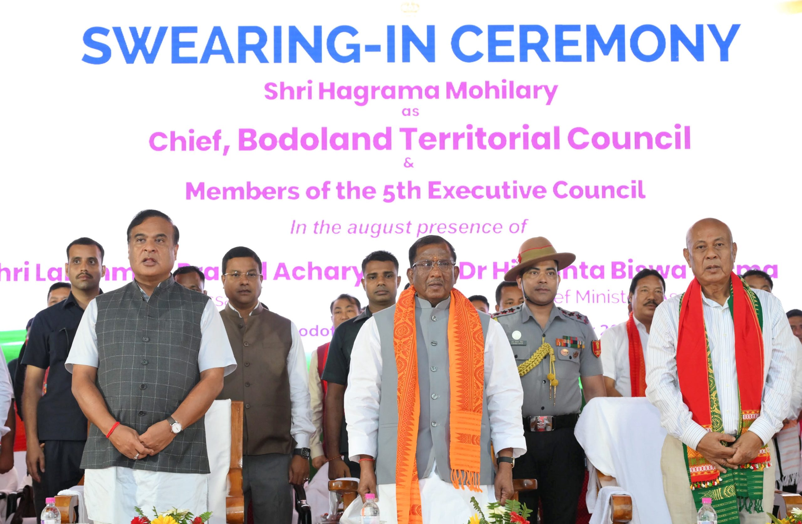 Kokrajhar: Assam Governor Lakshman Prasad Acharya, state Chief Minister Himanta Biswa Sarma and newly sworn-in Bodoland Territorial Council (BTC) Chief Executive Member (CEM) Hagrama Mohilary, during the latter's swearing-in ceremony, in Kokrajhar, Sunday, Oct. 5, 2025. (PTI Photo)(PTI10_05_2025_000162B)
