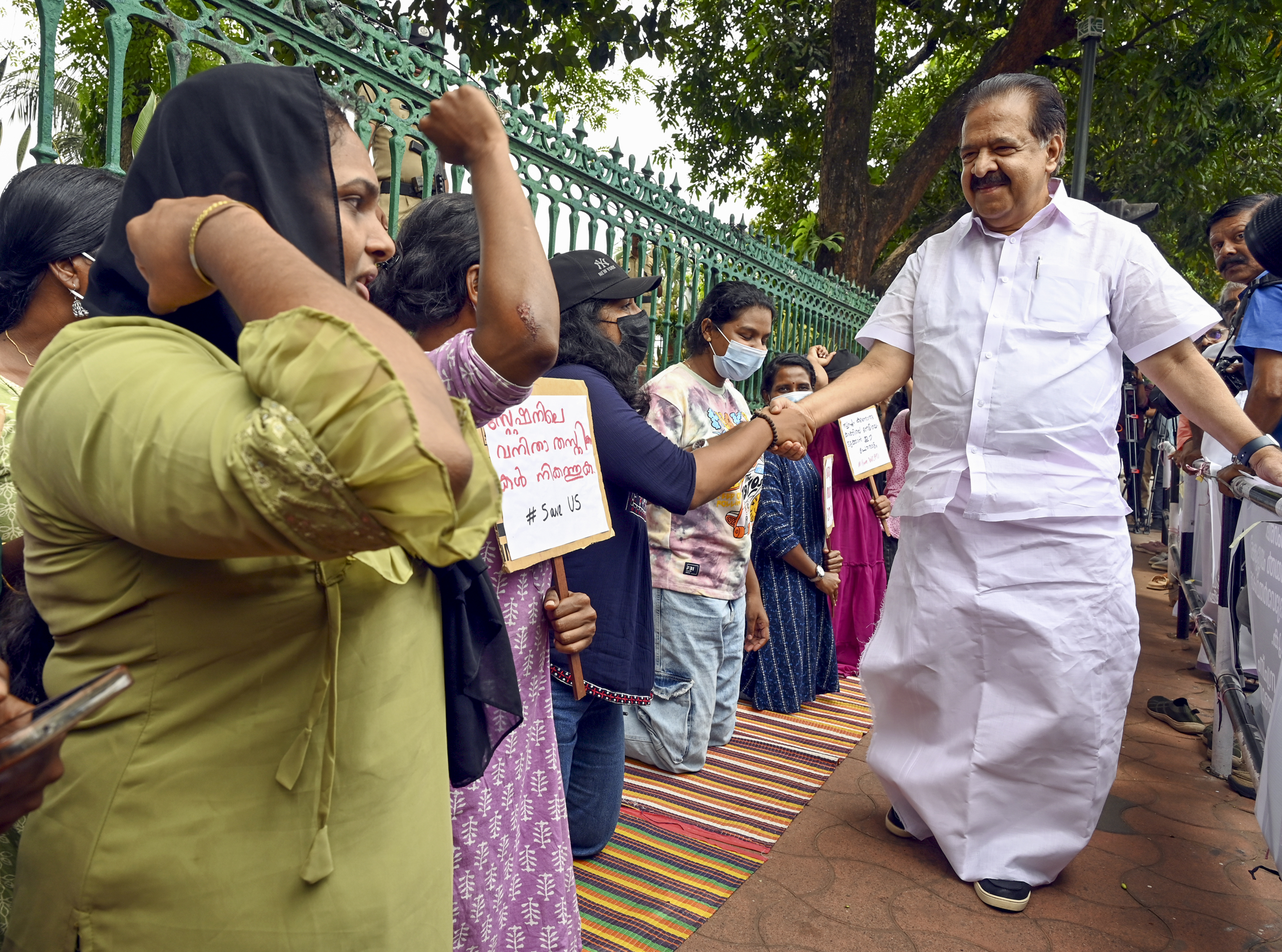 Thiruvananthapuram: Congress leader Ramesh Chennithala meets candidates on the Women Civil Police Officer (CPO) rank list during their protest demanding their appointment, outside the Kerala Secretariat, in Thiruvananthapuram, Thursday, April 10, 2025. (PTI Photo)(PTI04_10_2025_000203B)