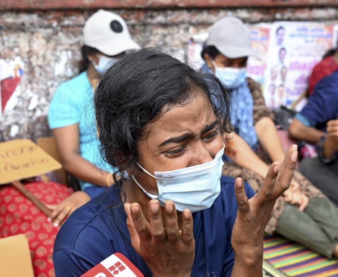 Thiruvananthapuram: A candidate of the Women Civil Police Officer (CPO) rank list gets emotional while speaking to the media during an ongoing protest demanding their appointment, outside the Kerala Secretariat , in Thiruvananthapuram, Tuesday, April 8, 2025. (PTI Photo)(PTI04_08_2025_000359B)