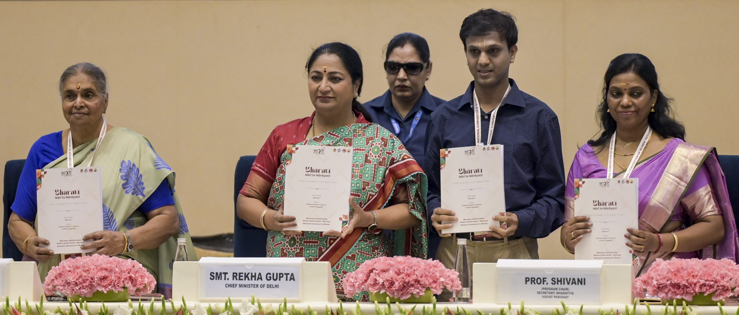 New Delhi: Delhi Chief Minister Rekha Gupta, second left, with others, poses for photographs during the 'Bharati - Nari to Narayani: National Convention of Women Thought Leaders' at Vigyan Bhawan, in New Delhi, Saturday, March 7, 2026. (PTI Photo)(PTI03_07_2026_000067B)