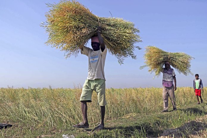 Workers at mustard field Birbhum: Farm workers at a mustard field, in Birbhum, West Bengal, Tuesday, April 8, 2025. (PTI Photo)(PTI04_08_2025_000405B)
