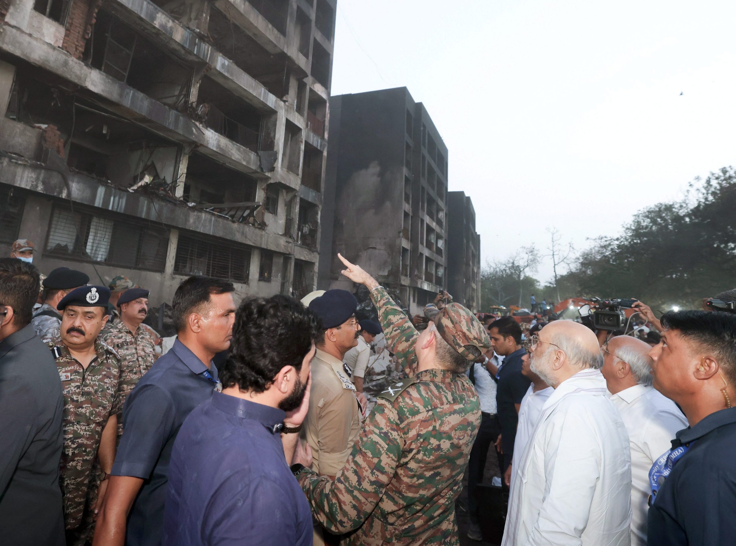 **EDS: THIRD PARTY IMAGE** Ahmedabad: In this image via @AmitShah on X, Union Home Minister Amit Shah visits the site of the Air India plane crash, in Ahmedabad, Thursday, June 12, 2025. The London-bound Air India plane carrying 242 passengers crashed moments after taking off from the Ahmedabad airport. (@AmitShah via PTI Photo)(PTI06_13_2025_000011B)