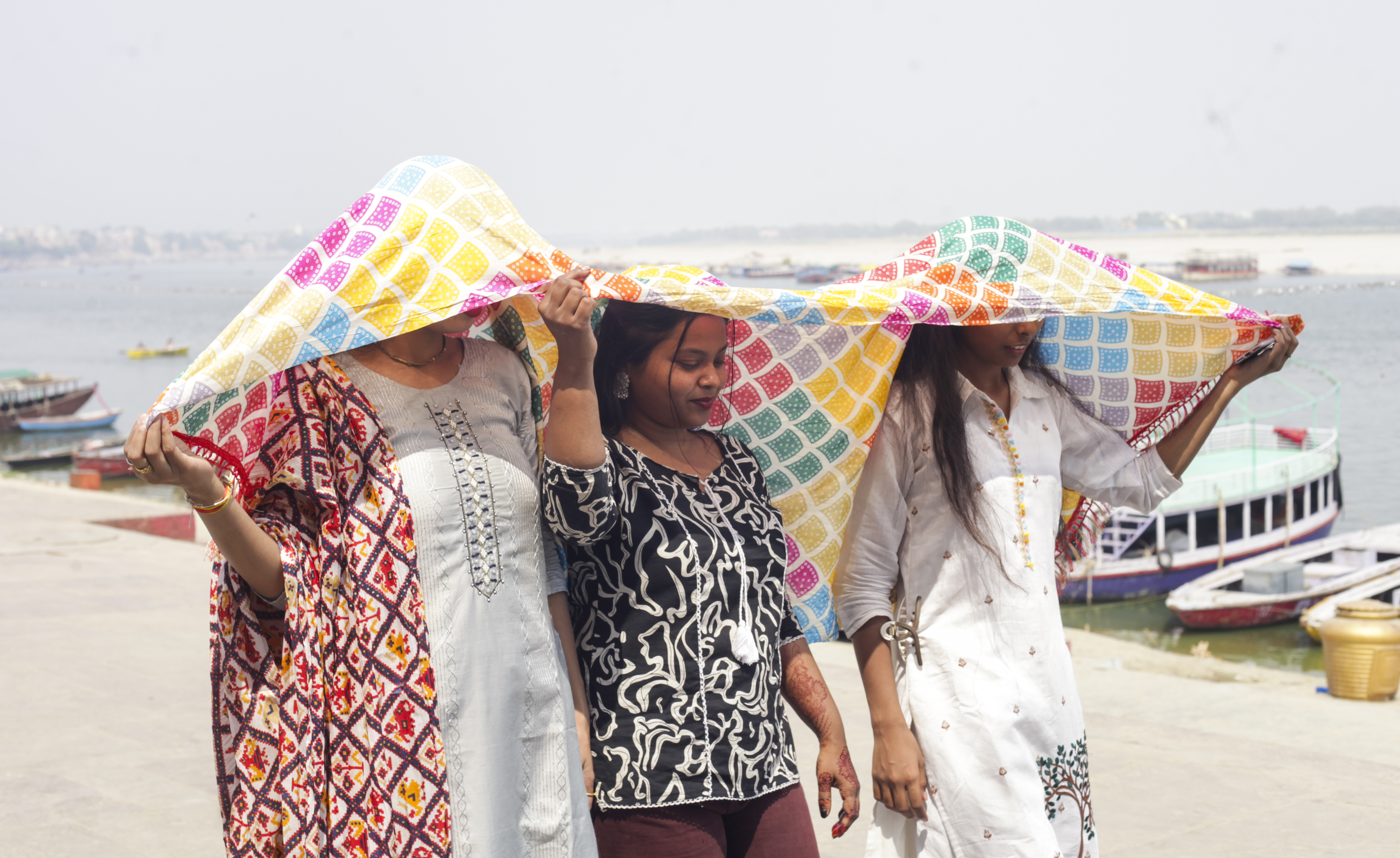 Varanasi: Young women use a scarf to shield themselves from the scorching sun as temperatures rise with the onset of summer, in Varanasi, Monday, April 7, 2025. (PTI Photo)(PTI04_07_2025_000127B)