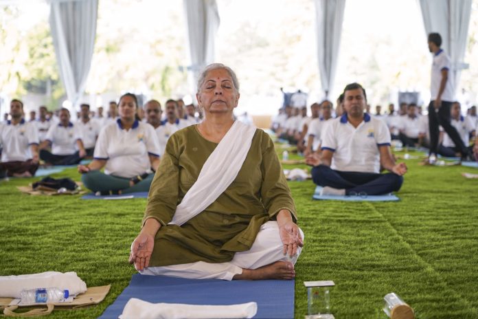 After joining a live session of the ‘Common Yoga Protocol’ led by Prime Minister Narendra Modi from Visakhapatnam, the finance minister attended a yoga session conducted by yoga practitioners from the Morarji Desai National Institute of Yoga.